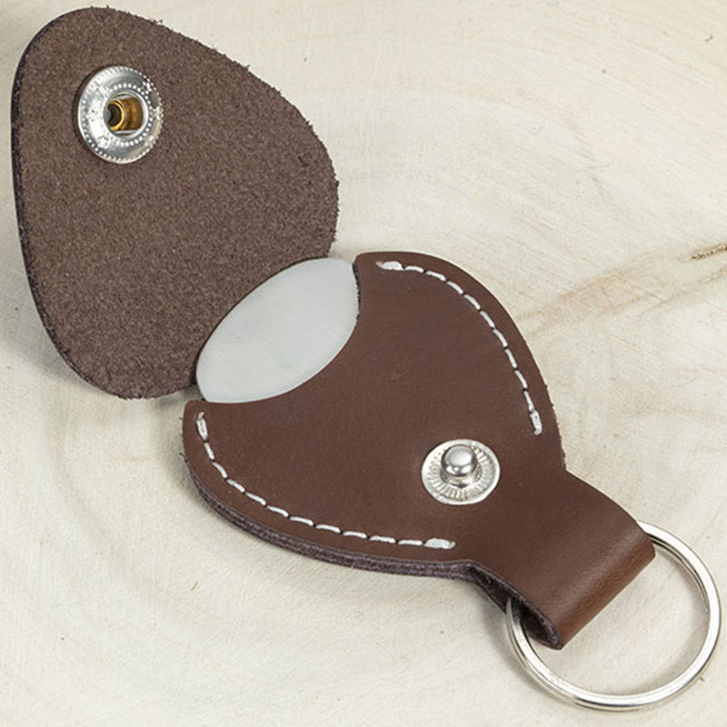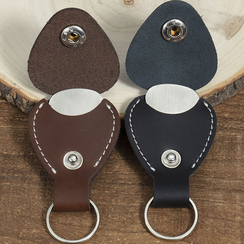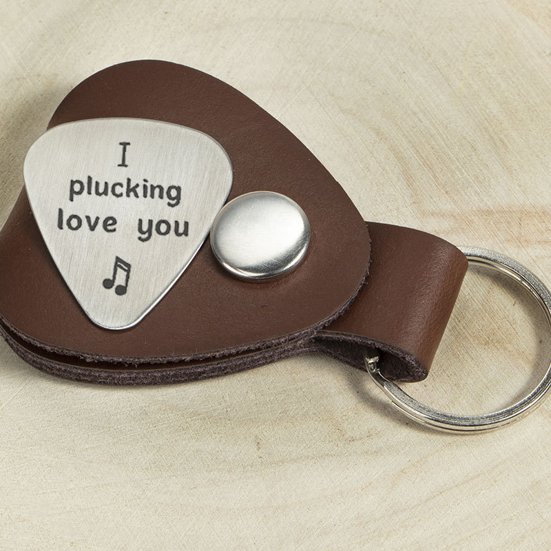 Leather guitar pick holder. Custom engraved guitar pick and guitar pick keychain holder.