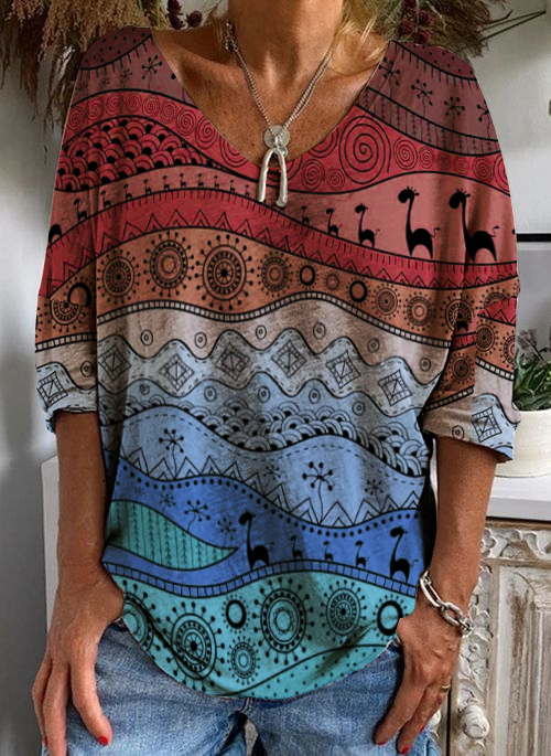 Women's V-Neck Fashion Patchwork Printed Long Sleeve Top