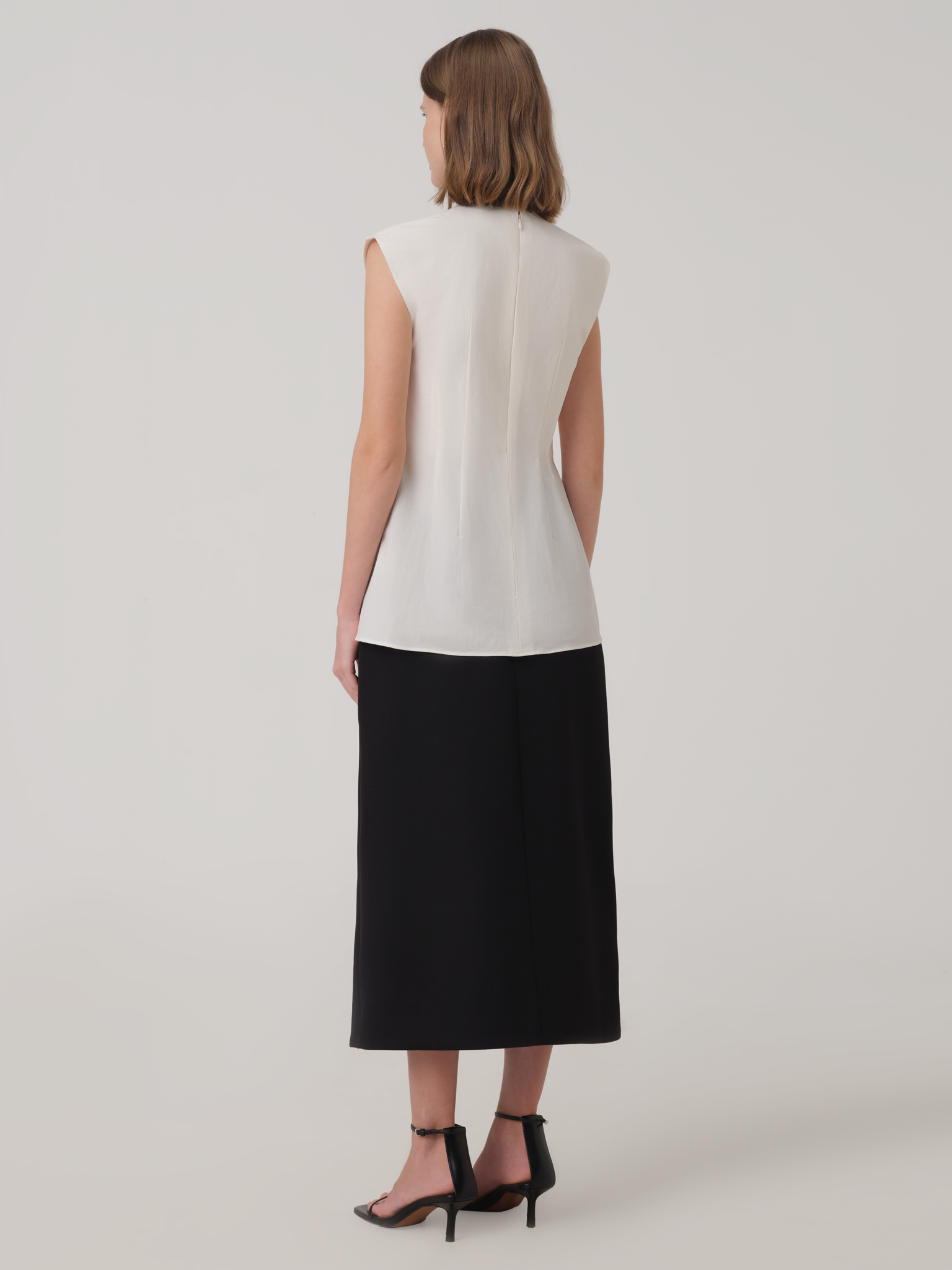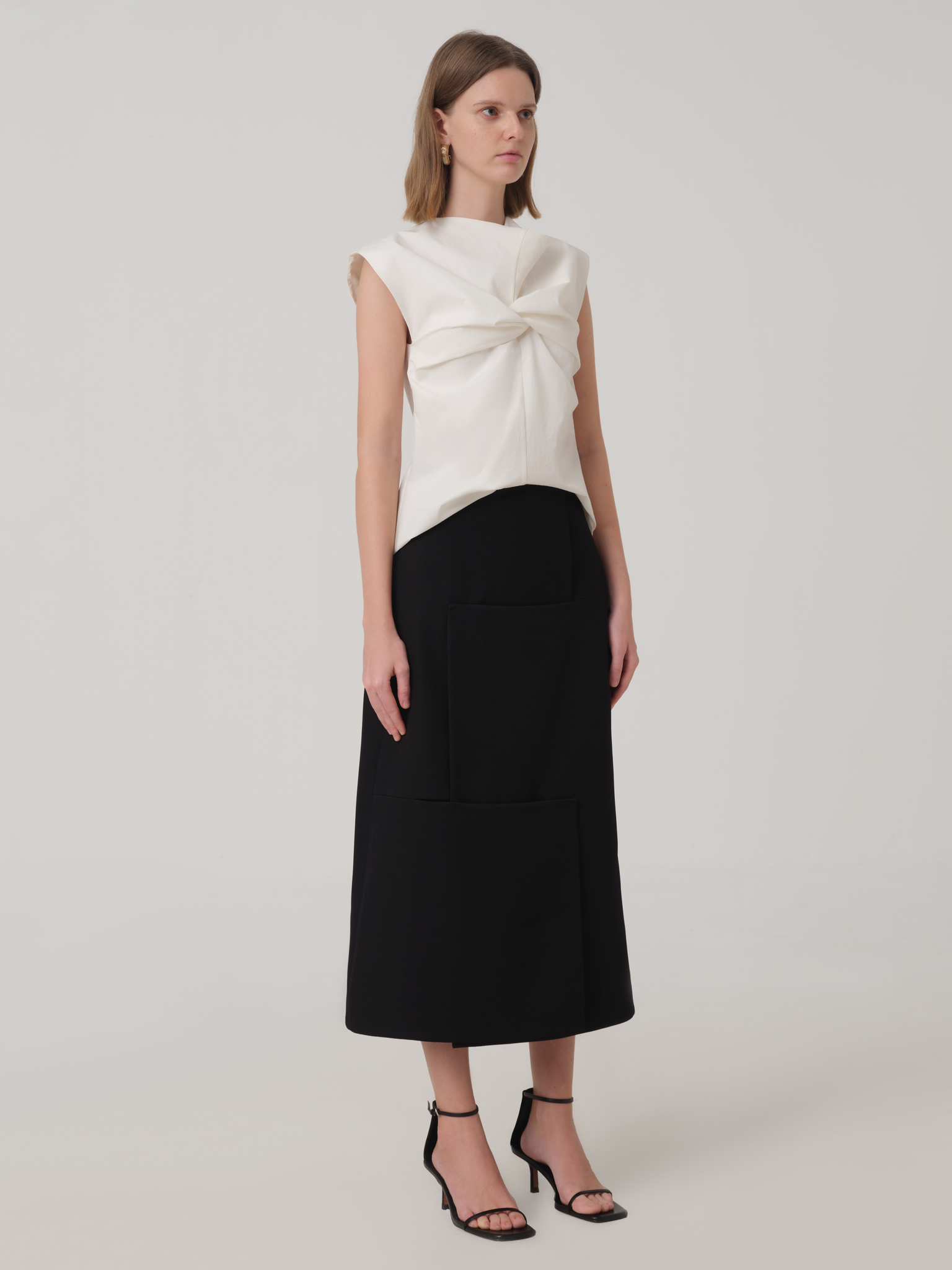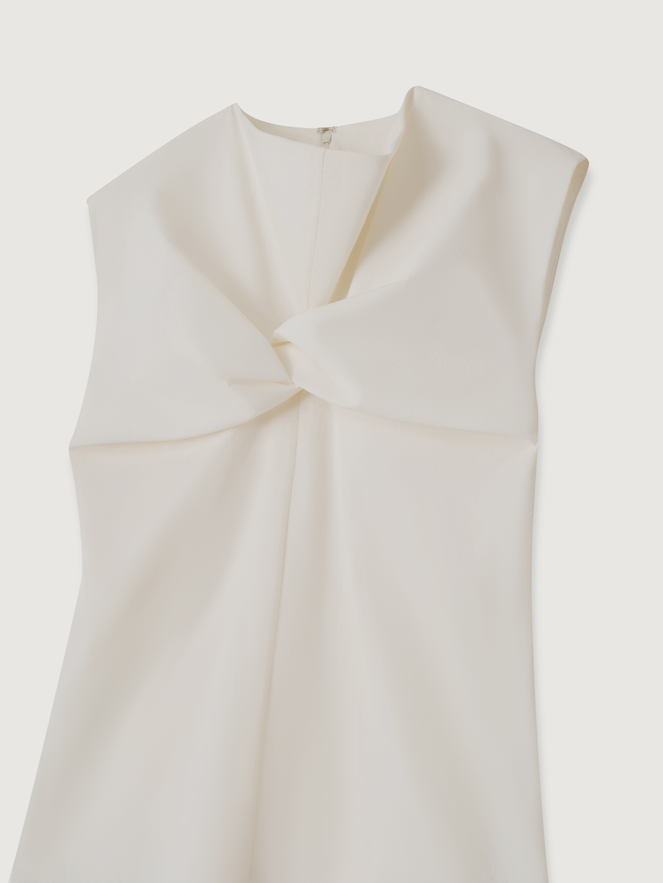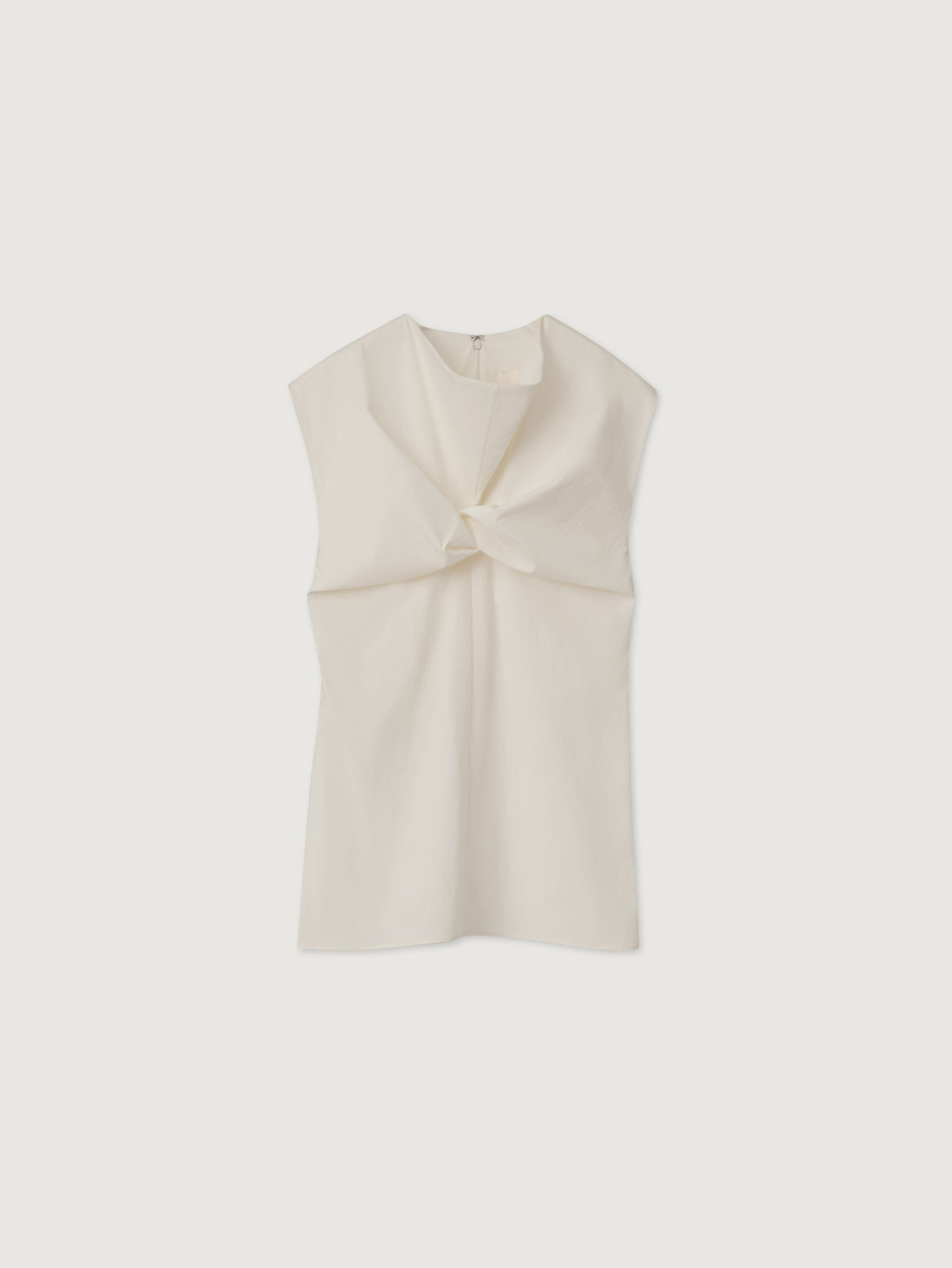 Relaxed fit sleeveless blouse with cowl neck detail and twisted at bustline.