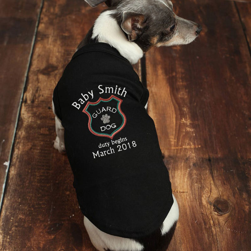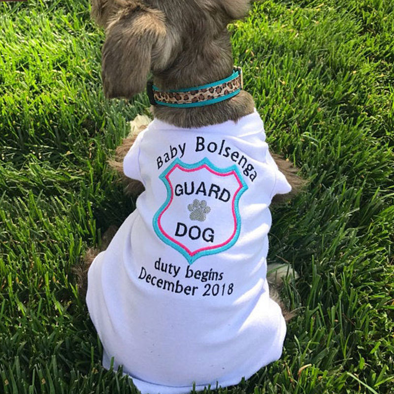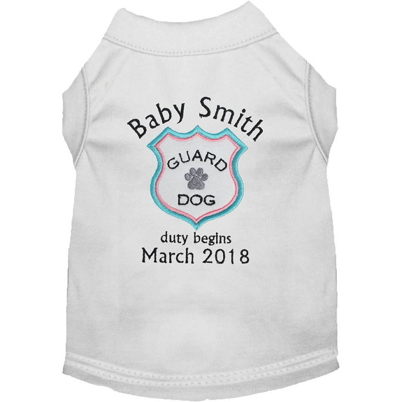 What a fun way to announce that your fur baby is going to be a Big Sister or Brother! The furry big sister to be will love this comfy and cozy tee, and it will keep her looking super cute at the same time! This personalized t shirt is sure to be your dog or cat's favorite shirt. This tee includes a cute "Baby ____ Guard Dog Duty Begins _____ " embroidery design on the back, featuring your requested name and date. This dog shirt makes a thoughtful and fun gift for an expecting mother to put on her pet to announce the pregnancy!