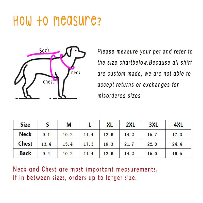*PLEASE NOTE: We are not responsible for customers who order the wrong size for their pets because no measurements were taken. Please follow the measuring instructions and refer to the size chart, it is very accurate.