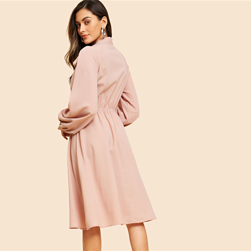 Pink Vintage Elegant Solid Tie Neck Pleat Detail Balloon Sleeve Knee Length Dress Autumn Workwear Women Dresses