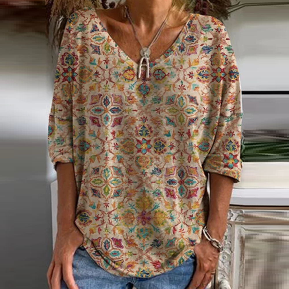 Women's New Fashion V-neck Colorful Print Long-sleeved Tops