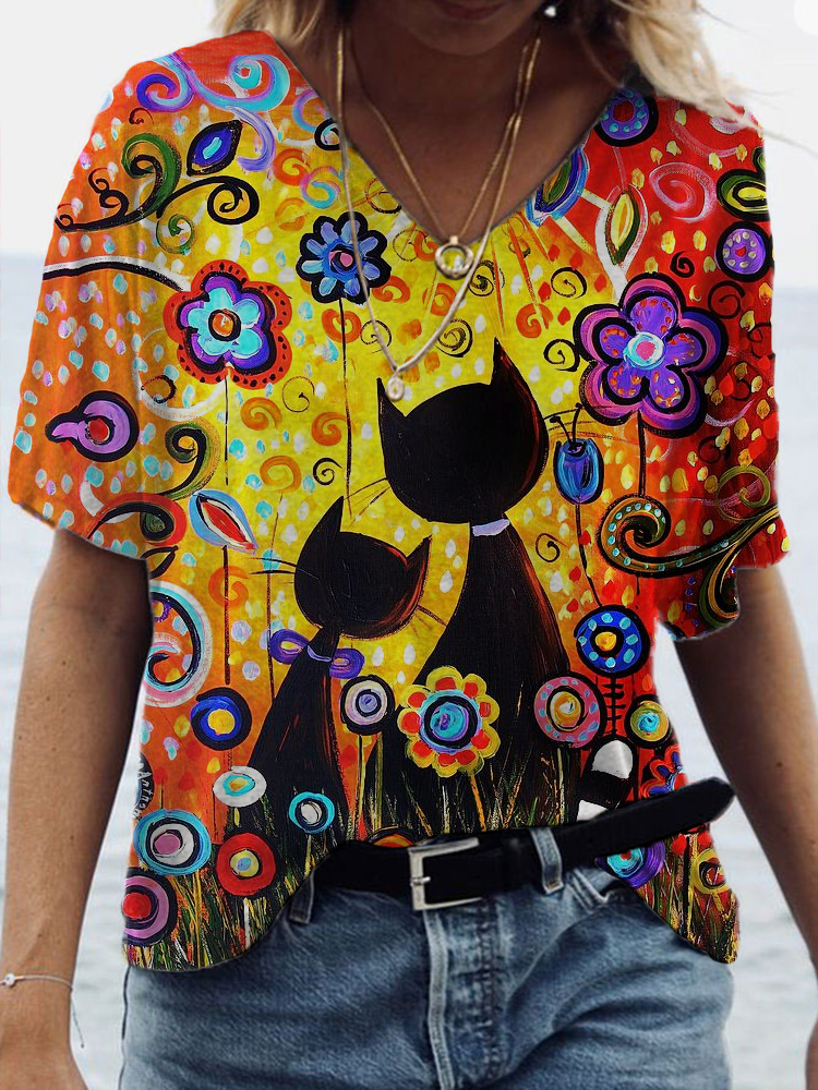 Women's T-Shirt-Cat Flower Oil Painting