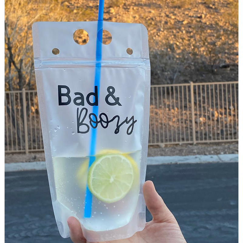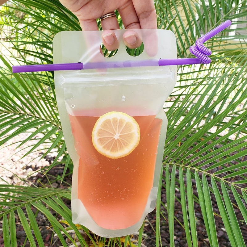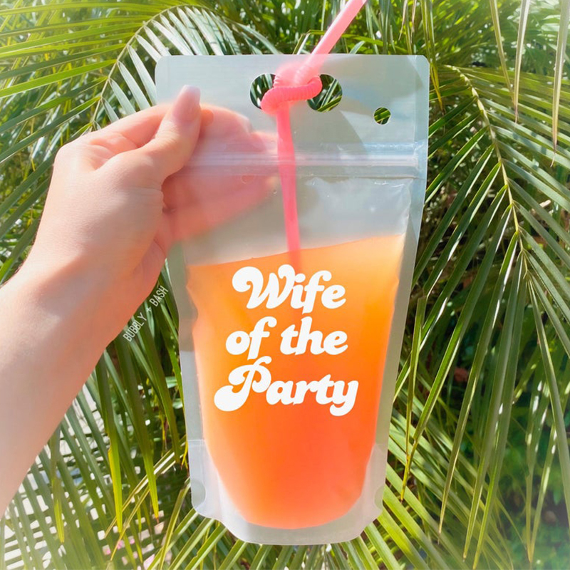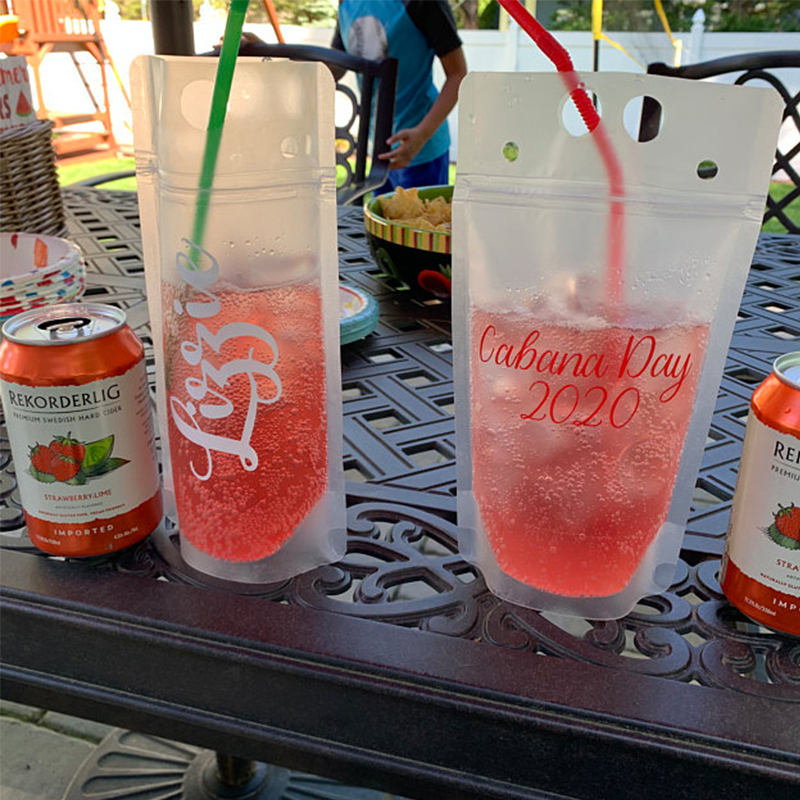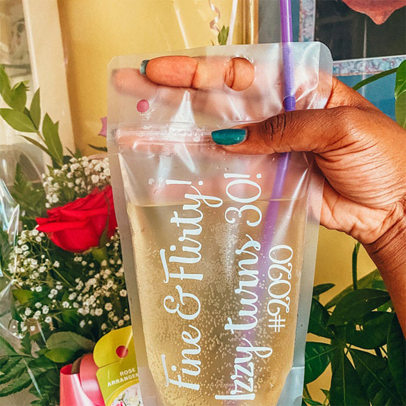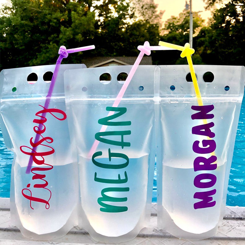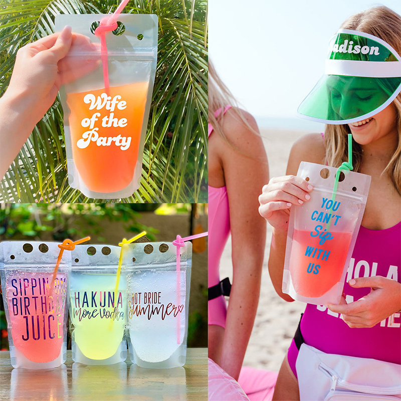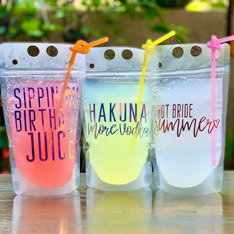 So fun! Bags have a recloseable zipper to ensure no leaks! Holds 17oz of your favorite beverage hot or cold! Bags are translucent in color, you can see the color of your drink. Hard to break! Bags can be laid flat which makes it easy to transport. has 2 holes on top for easy carrying and then also 2 holes to hold your straw when you are not using it! Brilliant! Order yours today for your bridal party or your upcoming girls trip!
