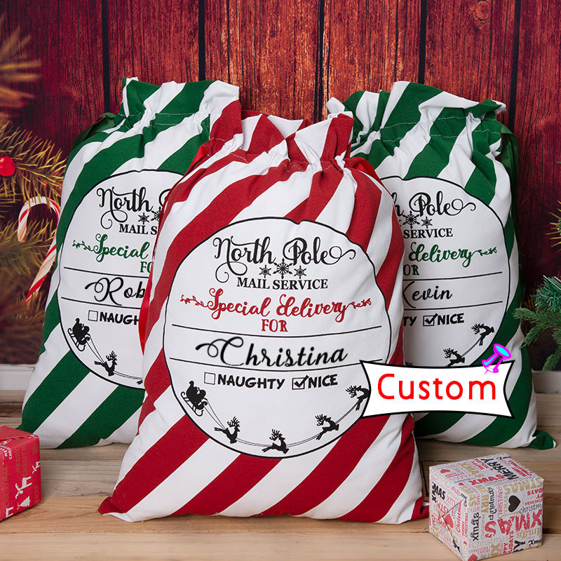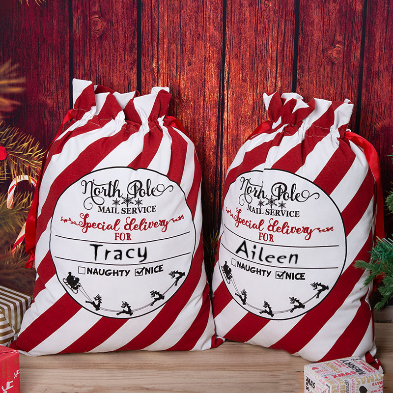 Each santa sack is made of 100% cotton fabric, in a Natural color, equipped with a side carrying strap (to make it easy for santa to lug around) and drawstring closure at the top.
