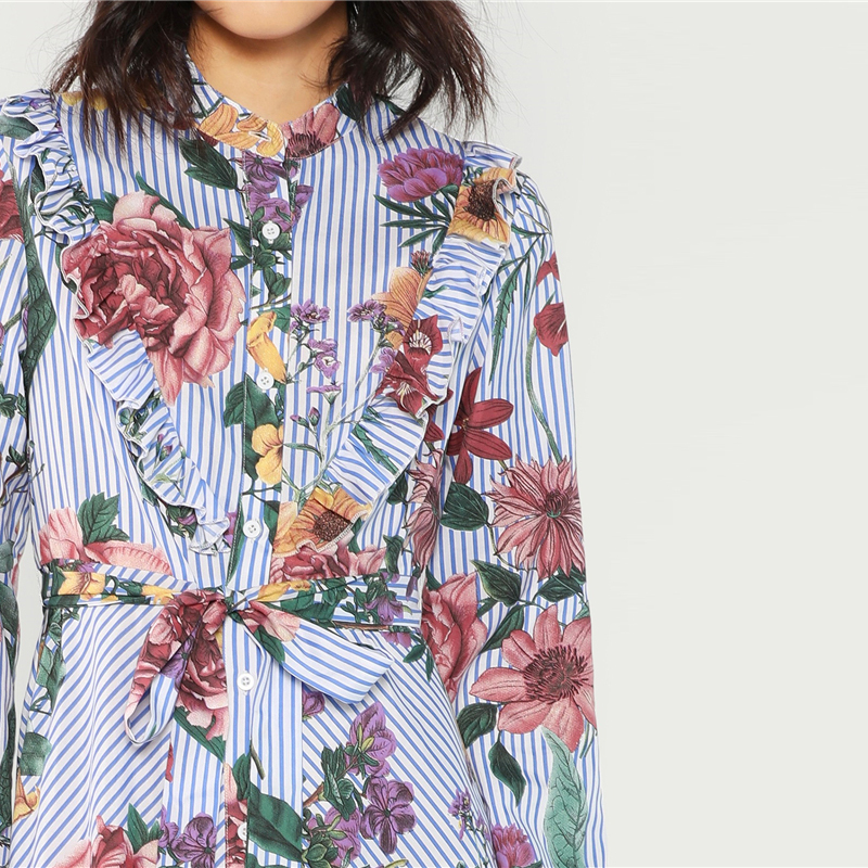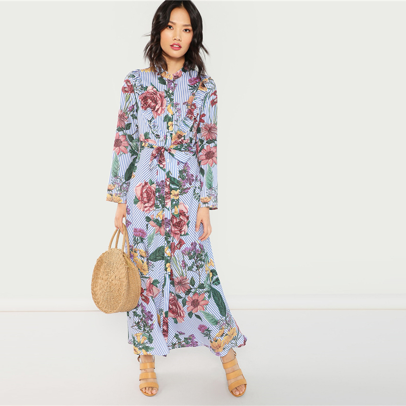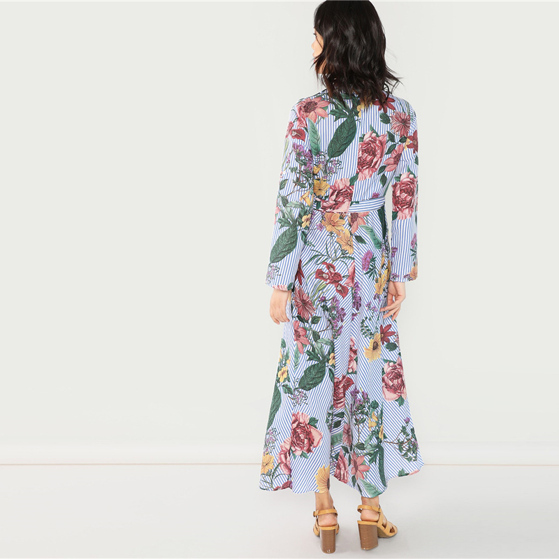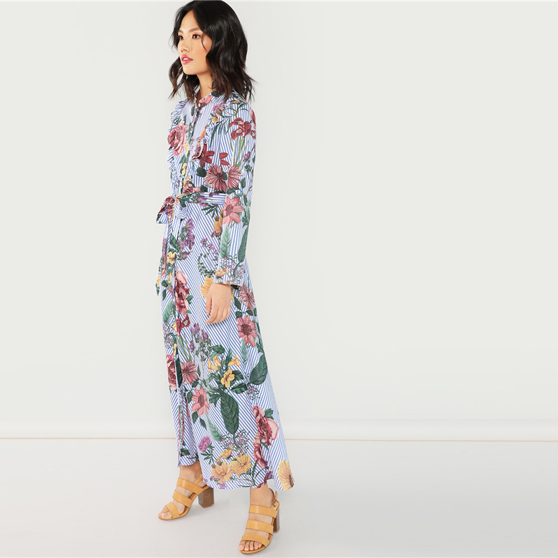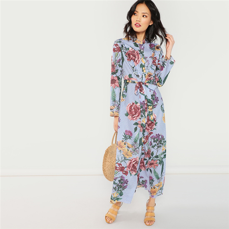 Multicolor Vacation Boho Bohemian Beach Button Front Belted Striped Floral Dress Autumn Holiday Highstreet Women Dresses