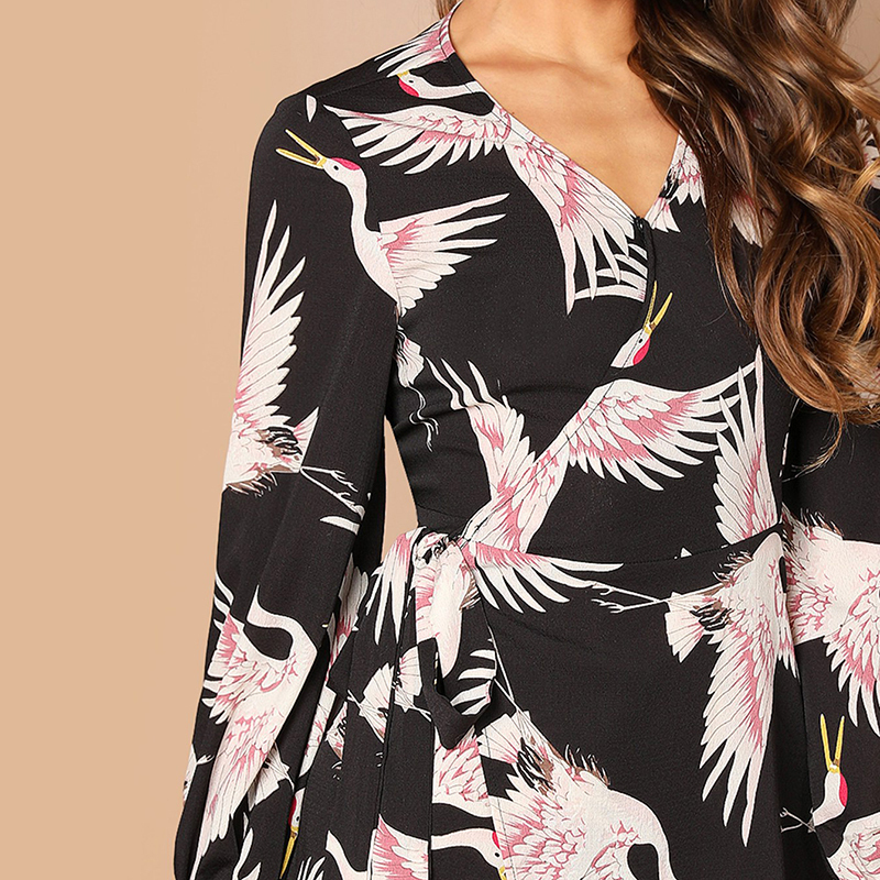 Black Red-crowned Crane Pattern Tie Waist Wrap Dress Elegant V Neck Above Knee Dress 2018 Autumn Modern Lady Women Dresses