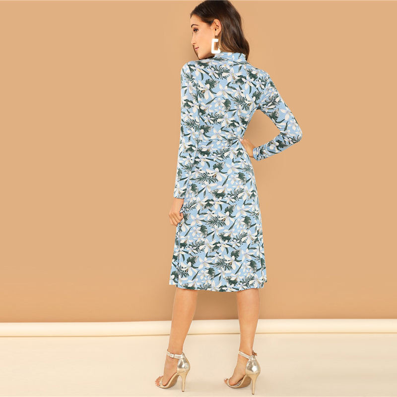 Blue Casual Floral High Neck Fit and Flare Knee Length Natural Waist Dress 2018 Autumn Elegant Women Dresses