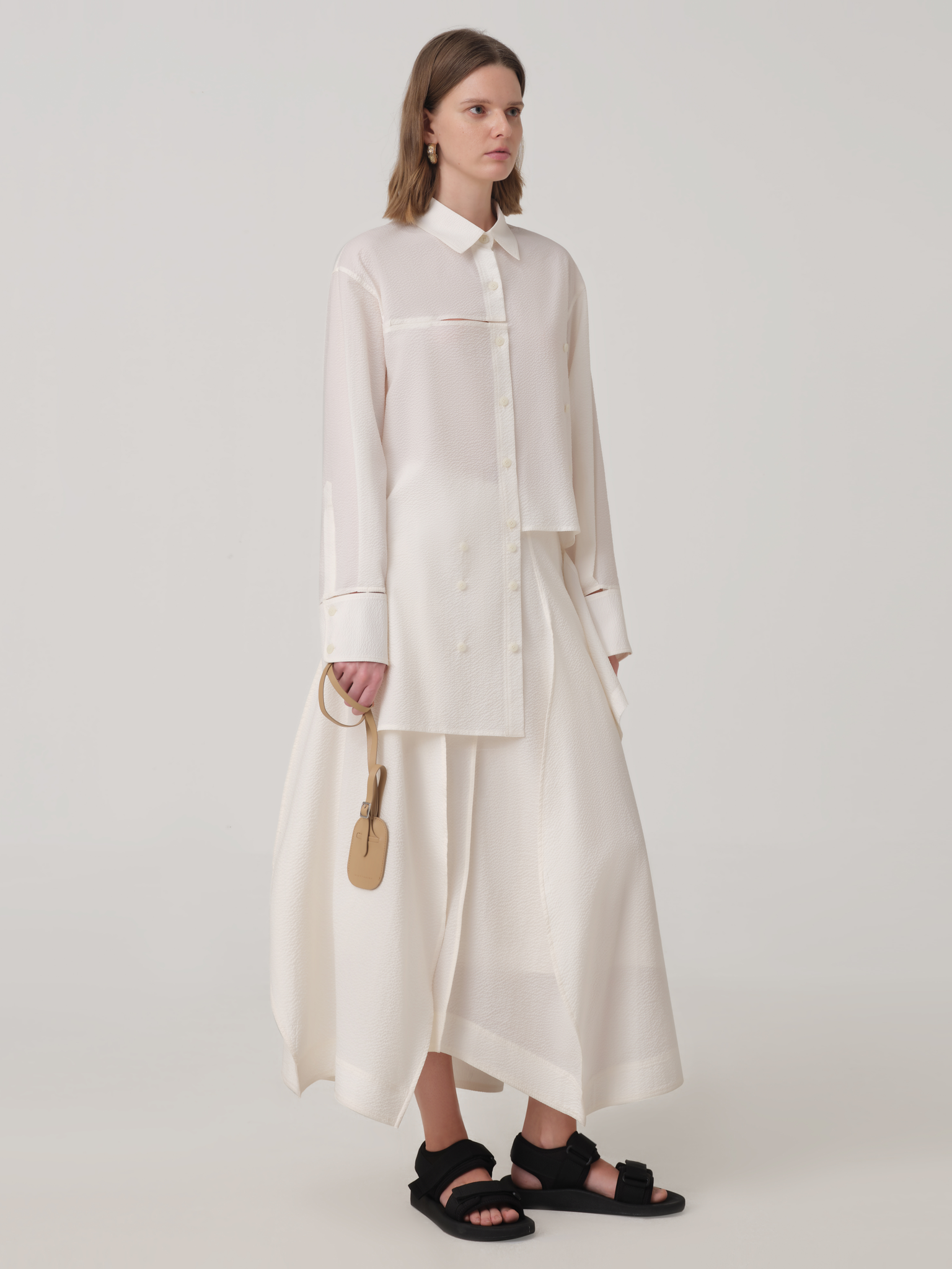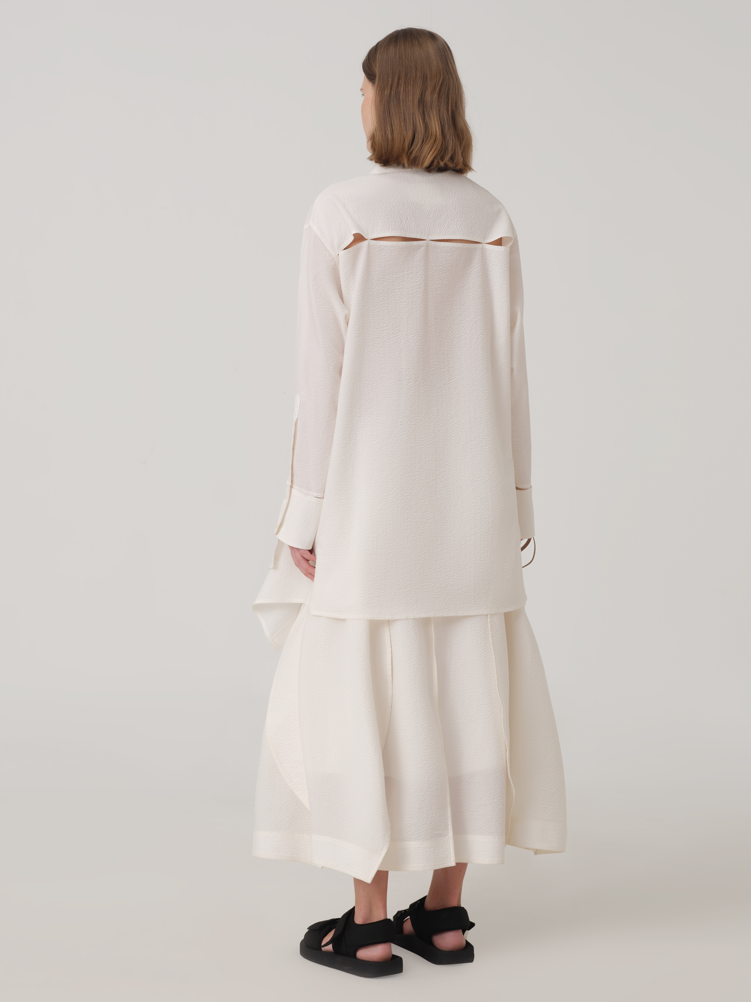 Mid-calf length skirt comes with an invisible zipper, created from multiple curved panels resembling a cocoon silhouette.