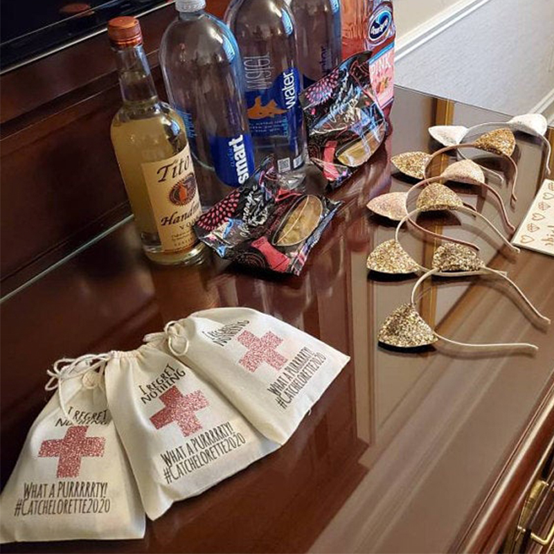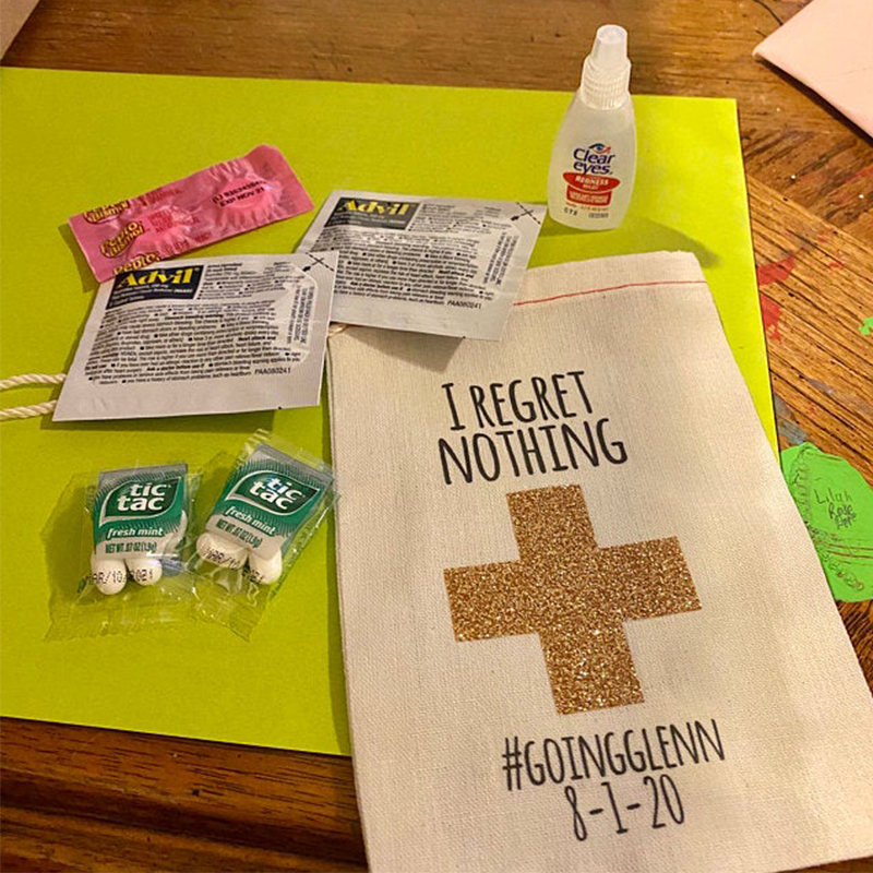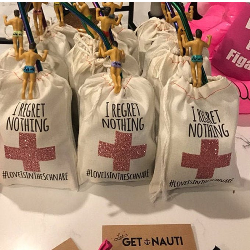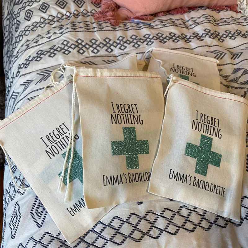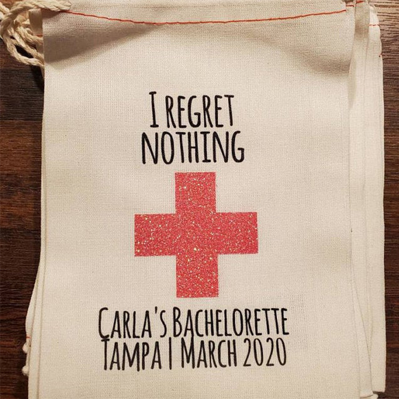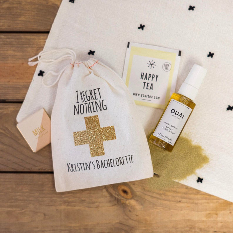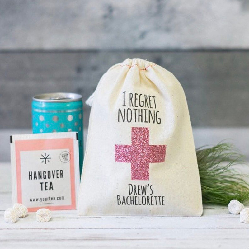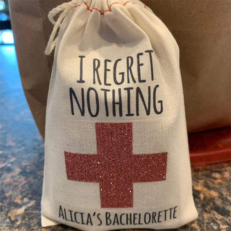 This listing includes {1} favor bag printed with our "I Regret Nothing" & glitter + design with optional custom text below, and it allows you to select the exact quantity you need. Easy peasy and perfect hangover kits for the morning after!