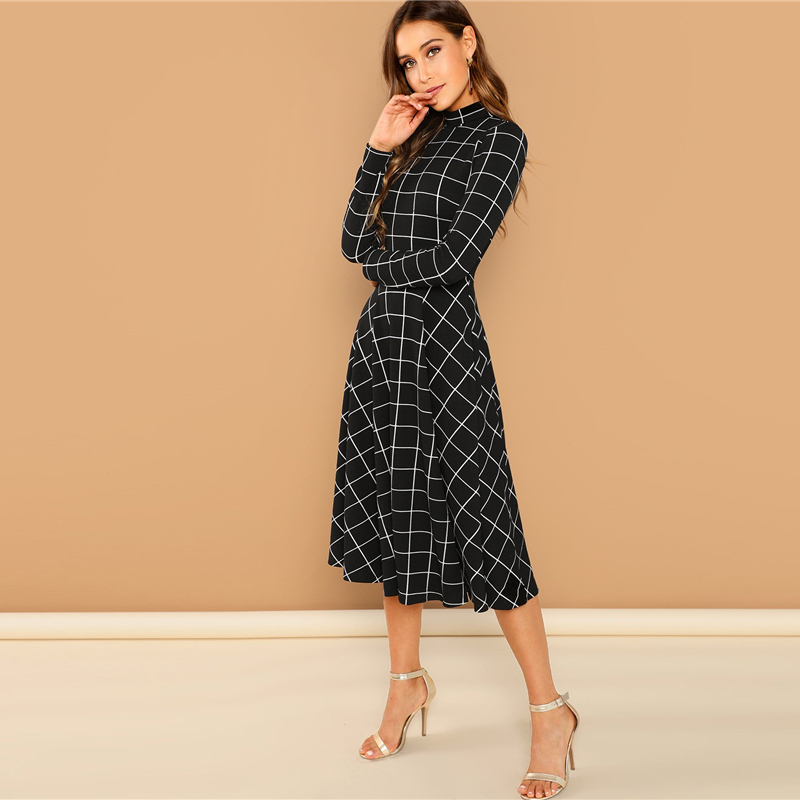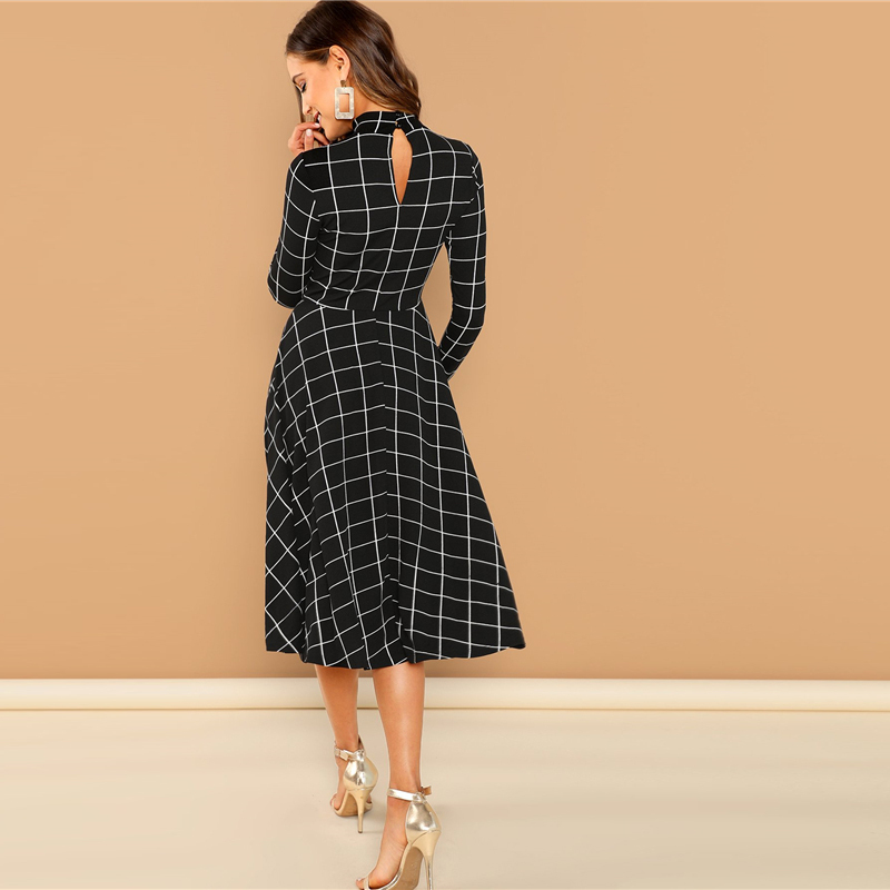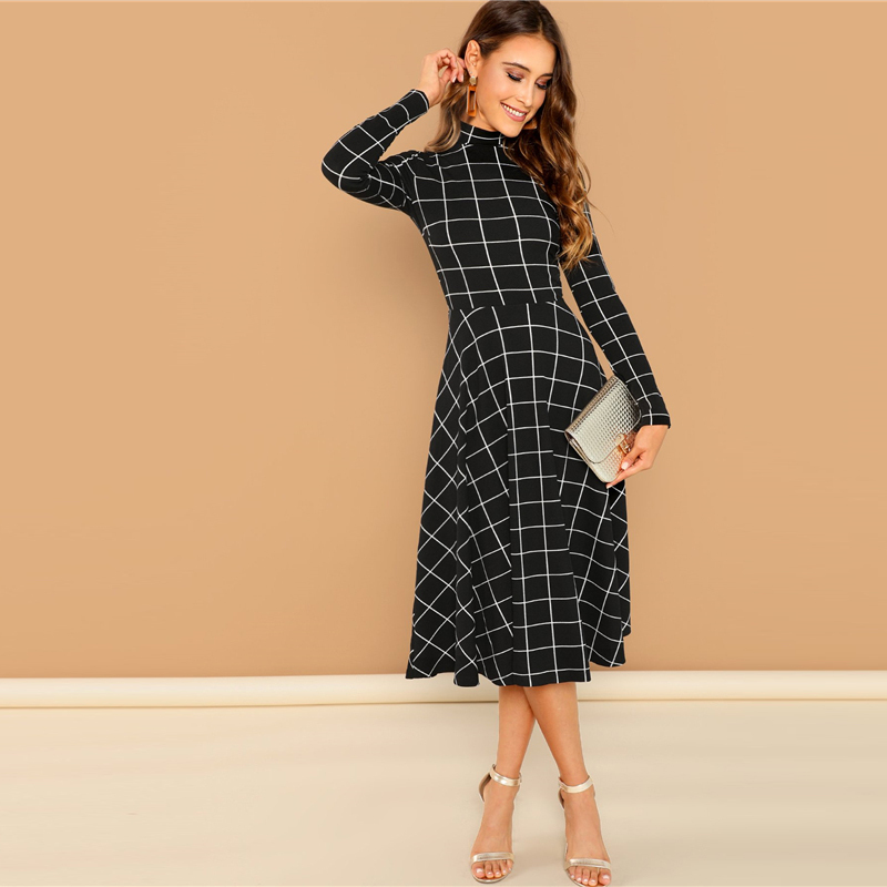 Black Elegant Plaid Print High Neck Fit And Flare Long Sleeve High Waist Dress 2018 Autumn Casual Women Long Dresses
