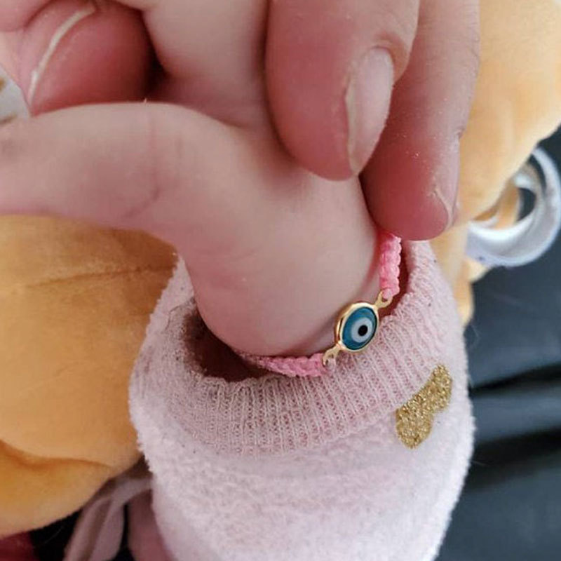 The Baby Red Bracelet features the classic blue lucky eye charm framed in gold-filled to provide the newborn with protective energies.