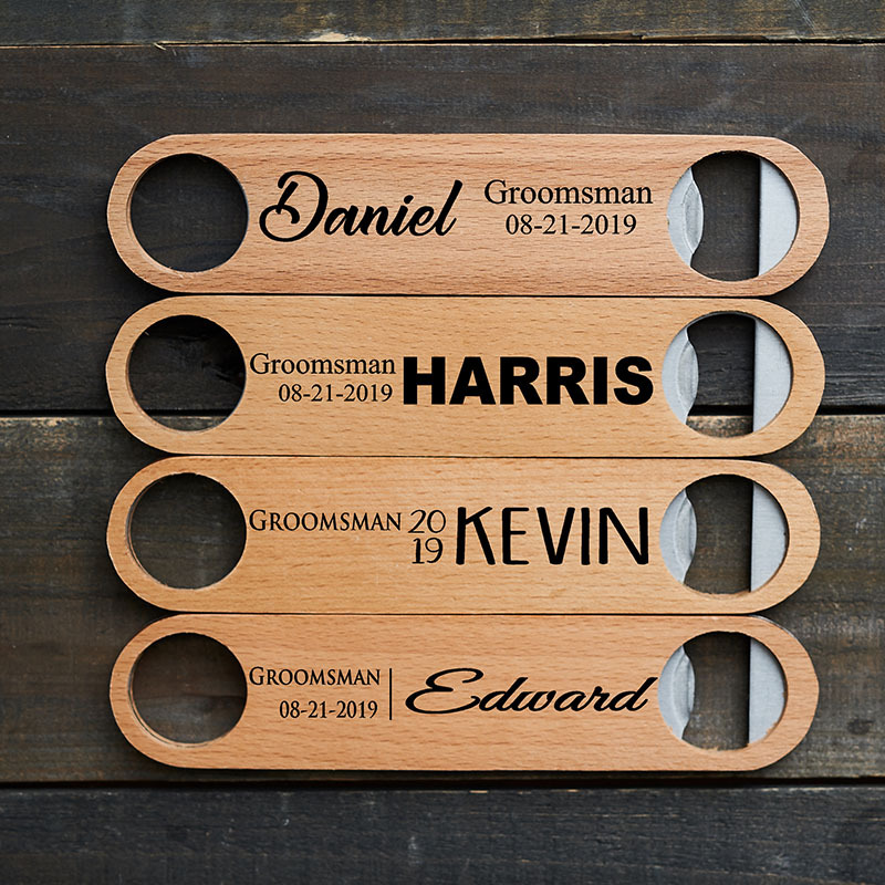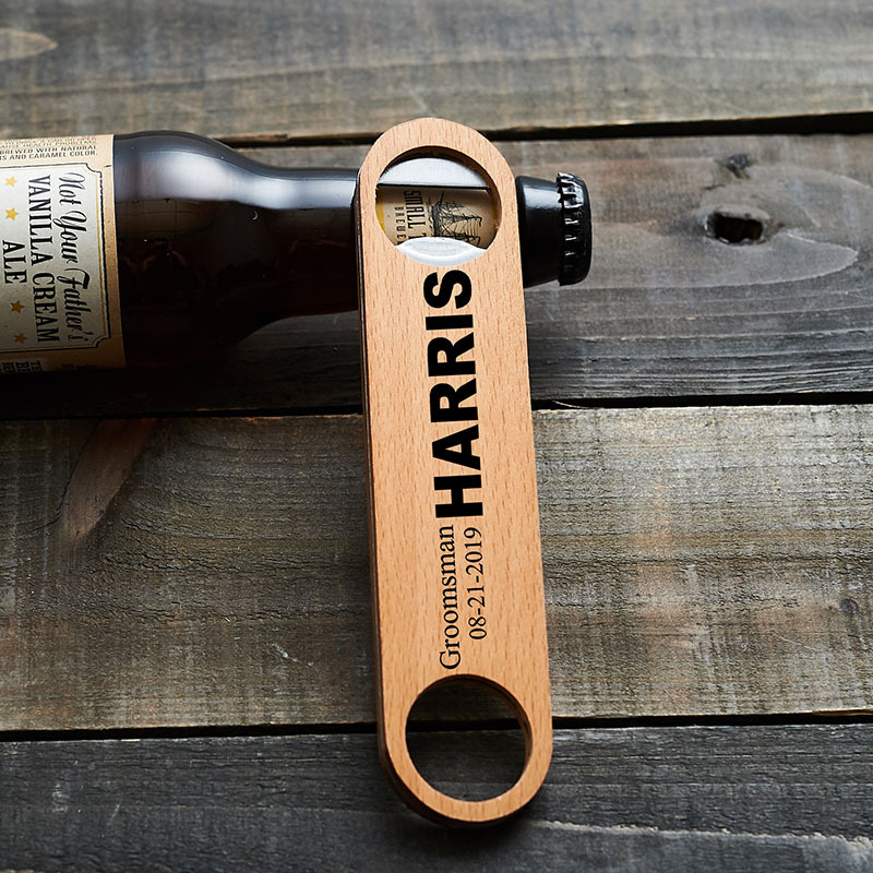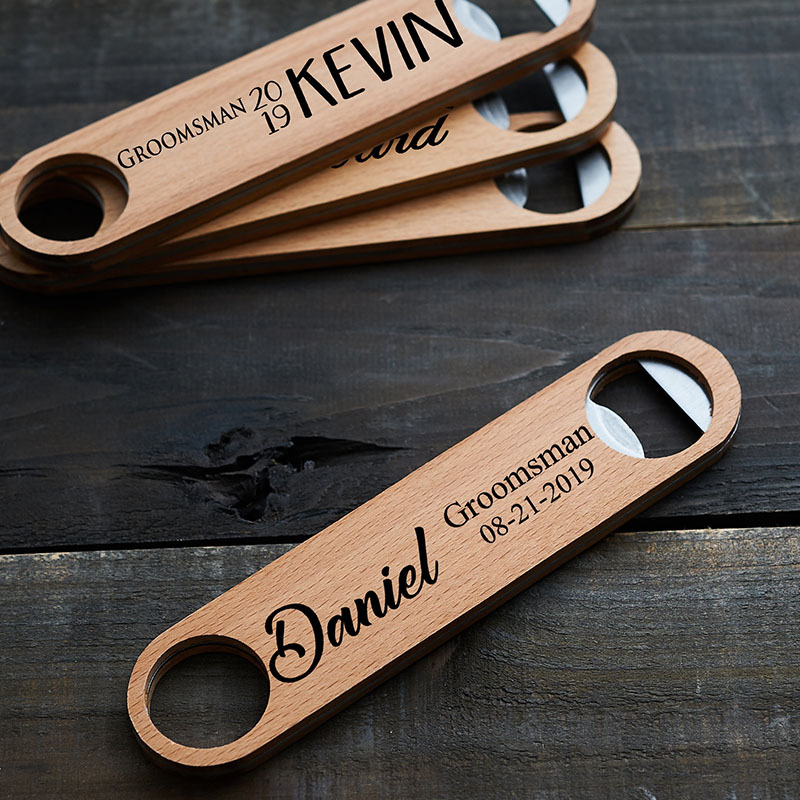 The accenting wood on this bottle opener allows for a stylish tool that can find a home in any bar. For wedding favor or anyone that is looking to give a personalized gift.