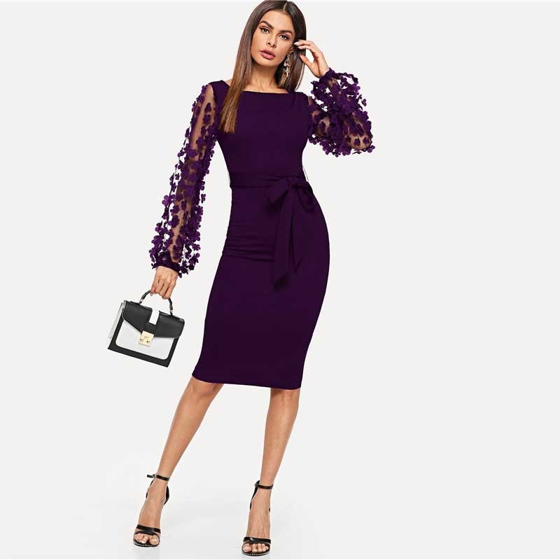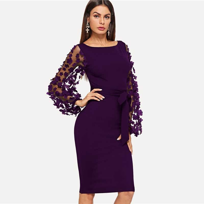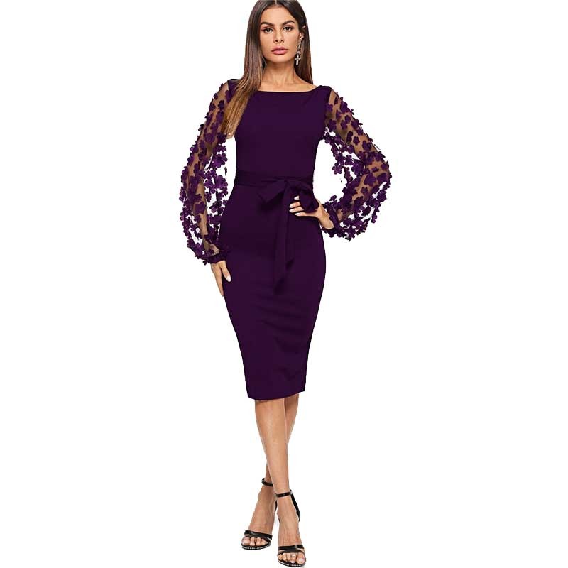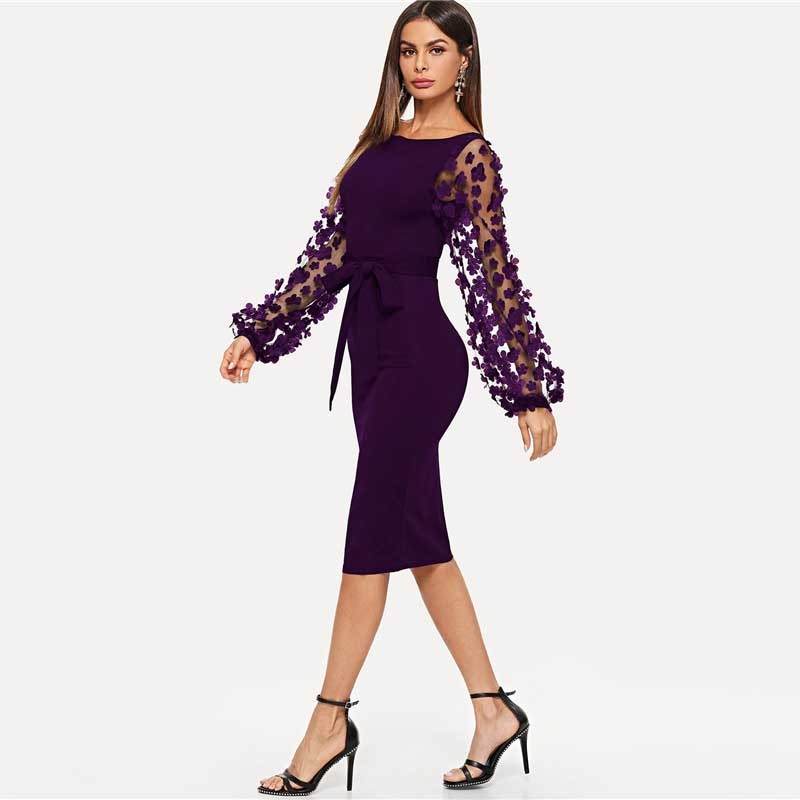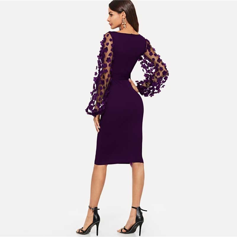 Purple Party Elegant Solid Flower Applique Mesh Sleeve Form Fitting Skinny Pencil Dress Autumn Office Lady Women Dresses