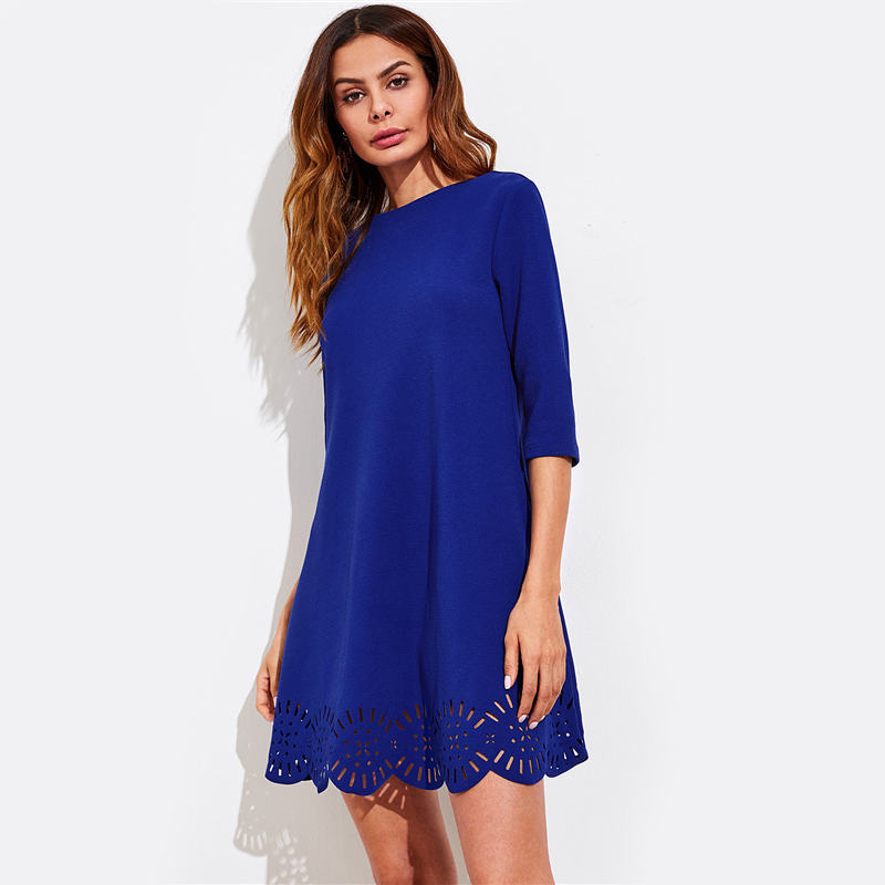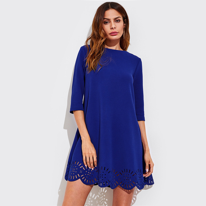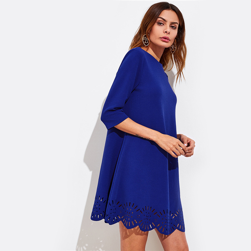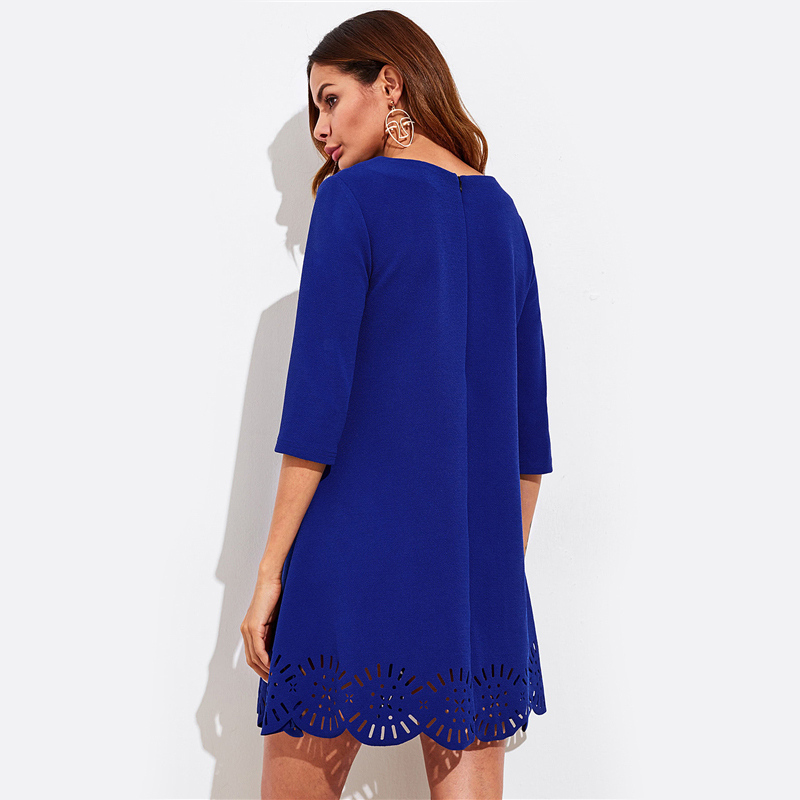 Scallop Laser Cut Hem Swing Dress Royal Blue Three Quarter Length Sleeve Zipper Back Casual Straight Dress