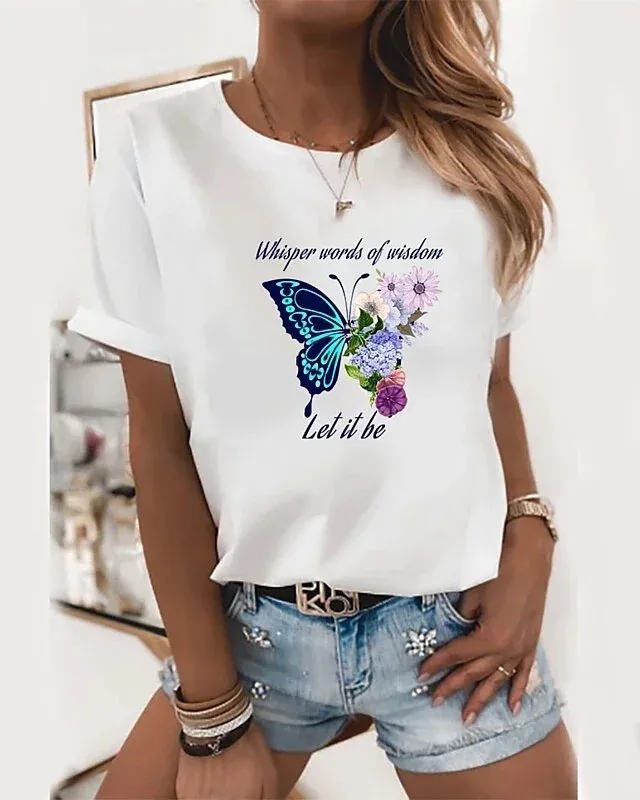 Women's T shirt Floral Butterfly Text Print Round Neck Tops
