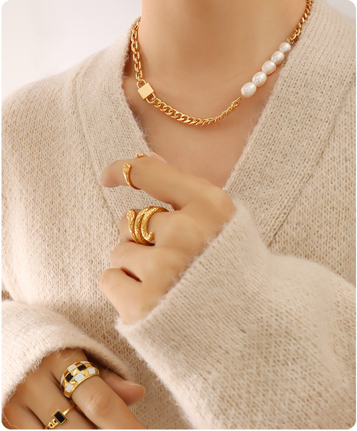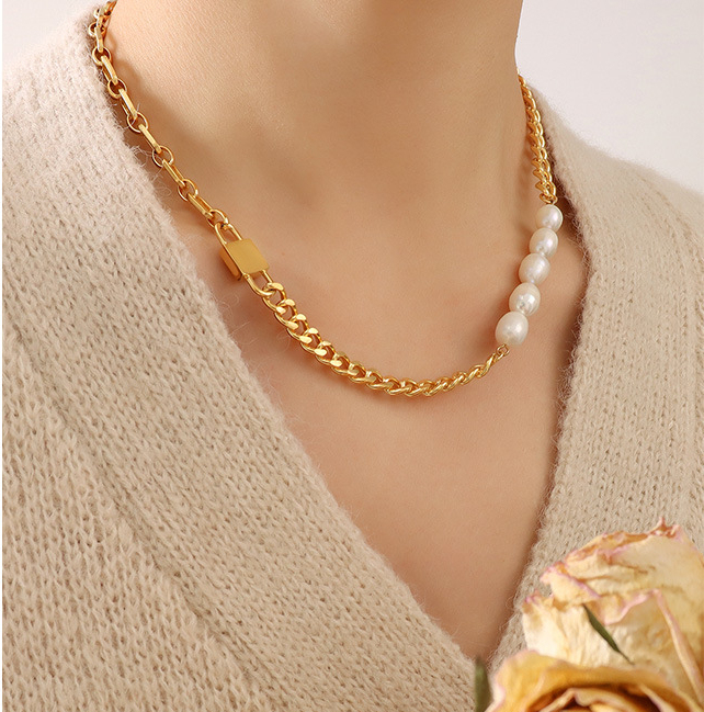Baroco Style Chunky Chain Splicing Locker Head & Pearl Necklace