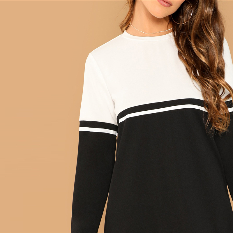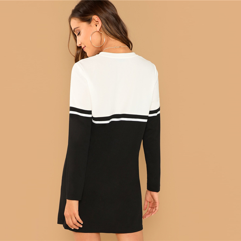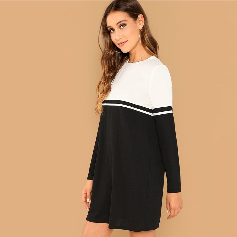 Black And White Elegant Color Block Round Neck Long Sleeve Natural Waist Dress 2018 Autumn Casual Fashion Women Dresses