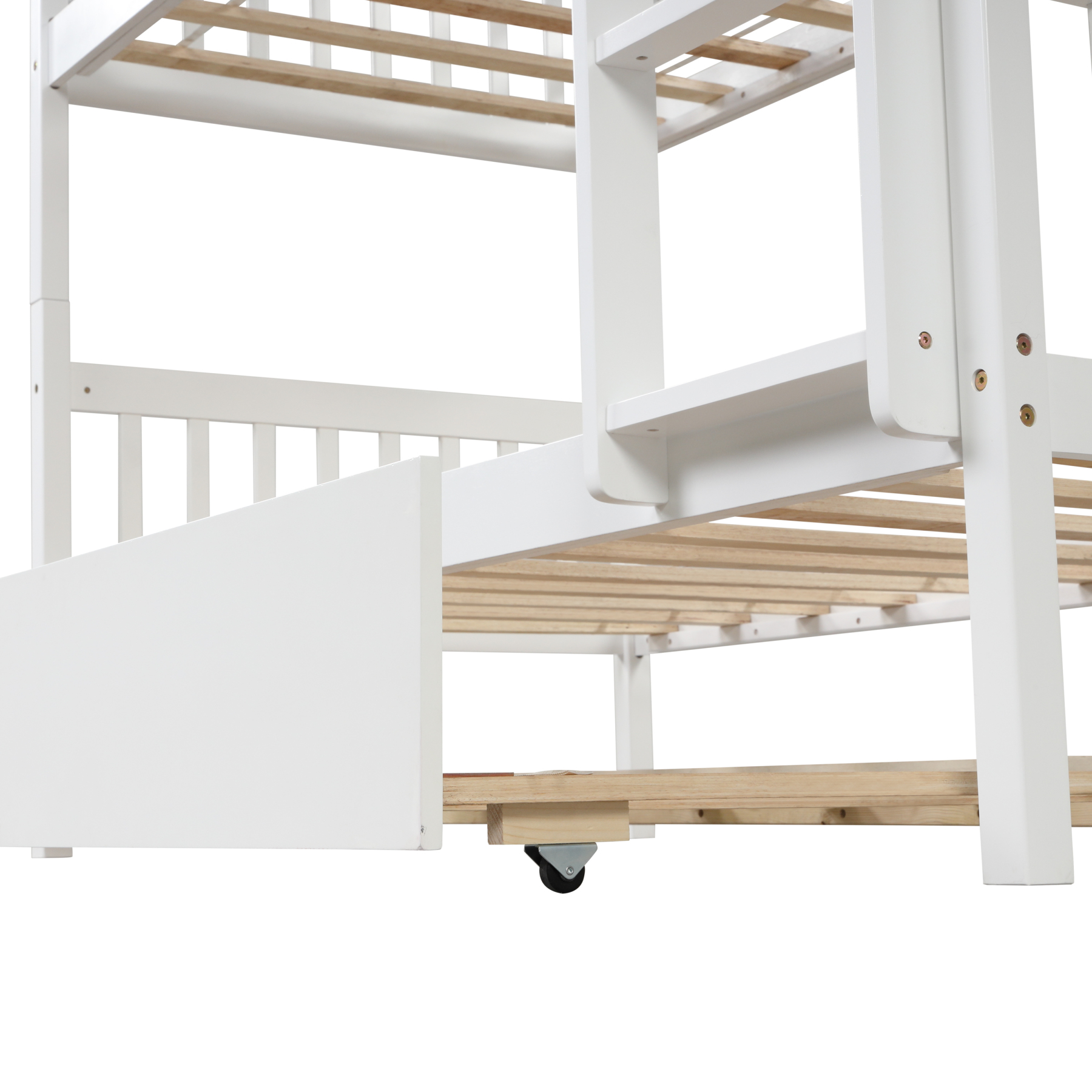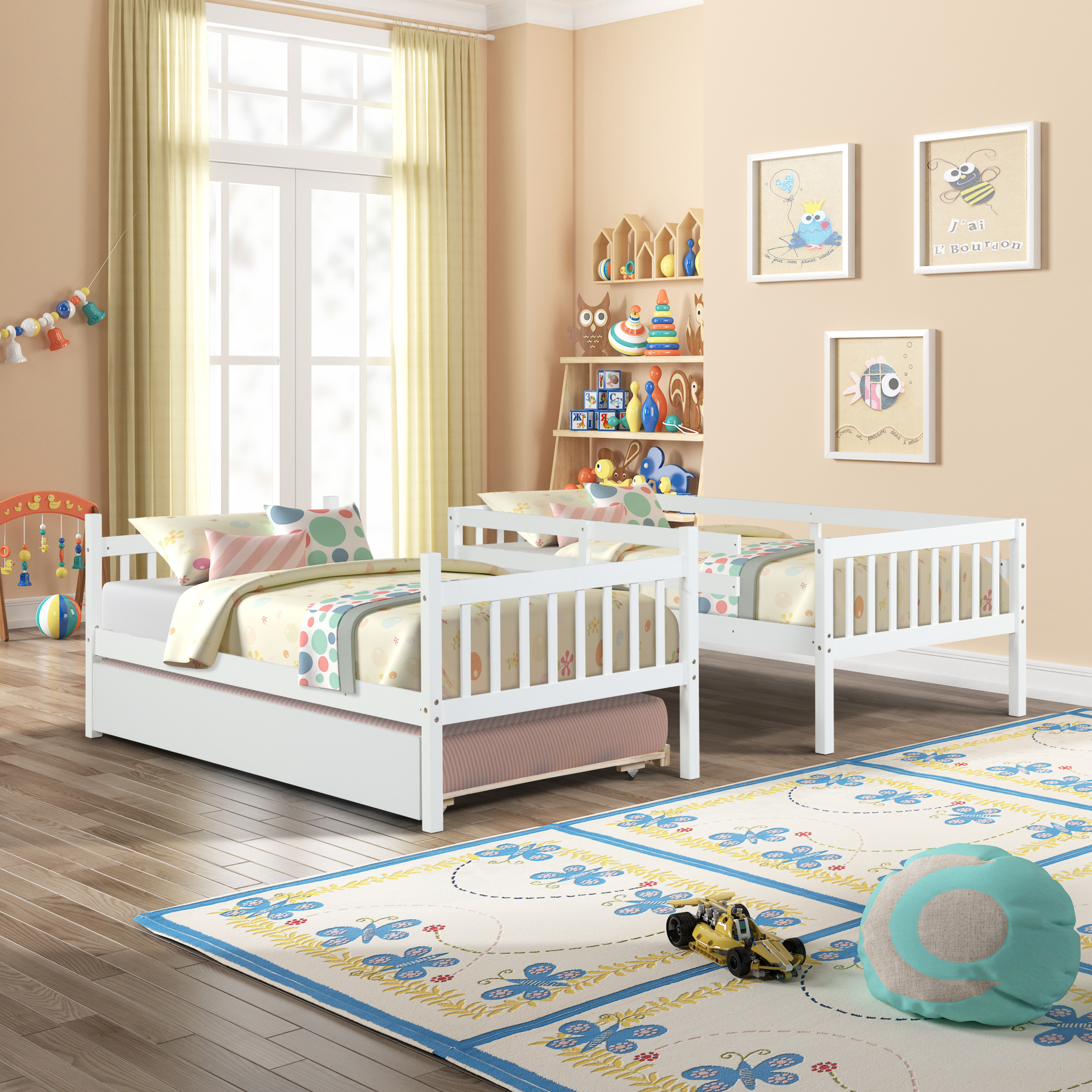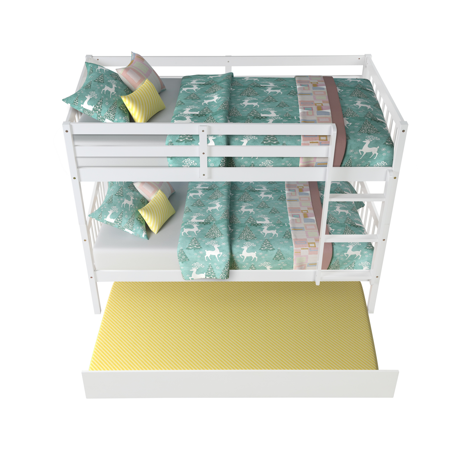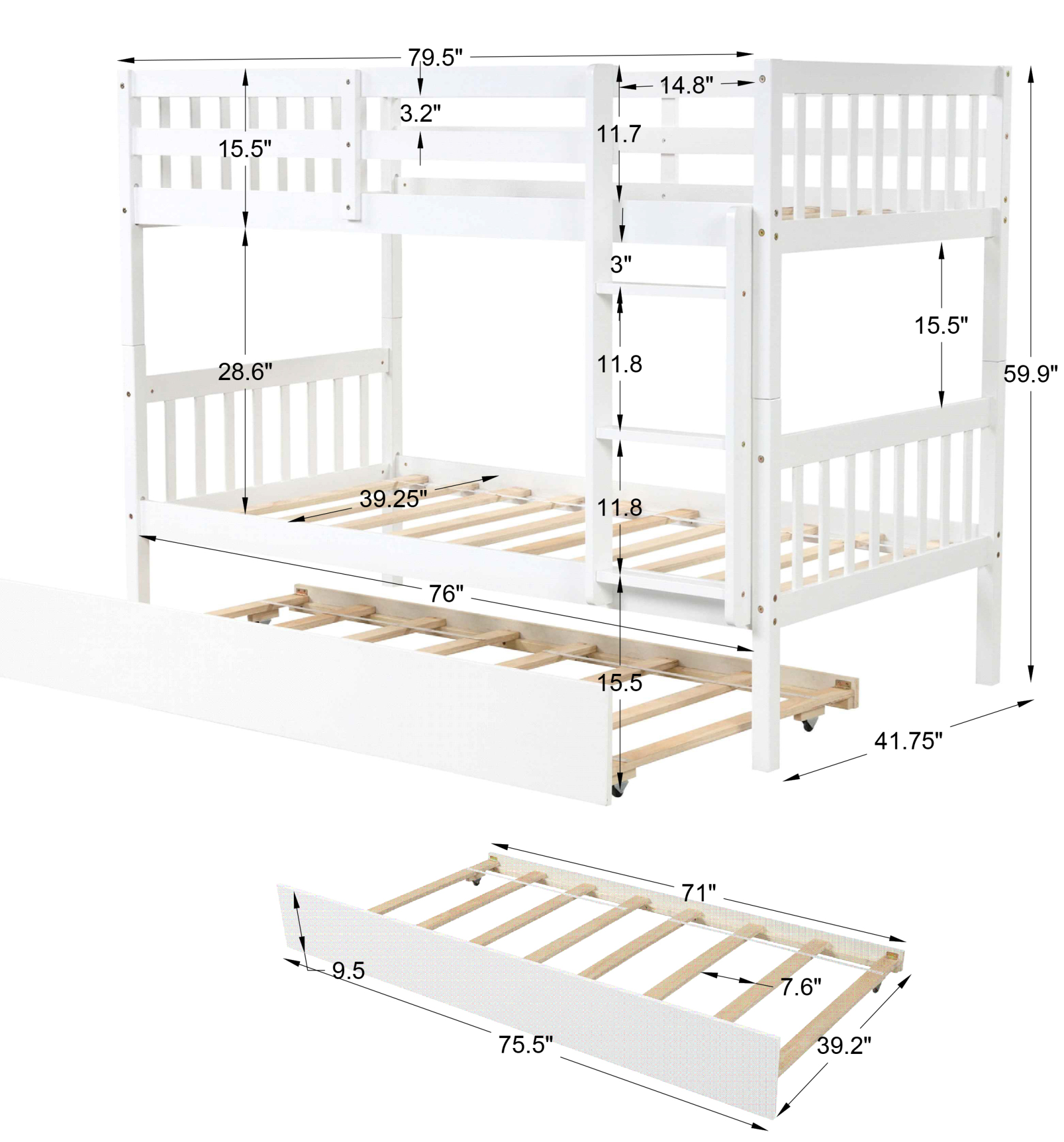 Kids Convertible Wooden Bunk Bed Frame with Twin Trundle, Safety Rail and Ladder, Twin over Twin