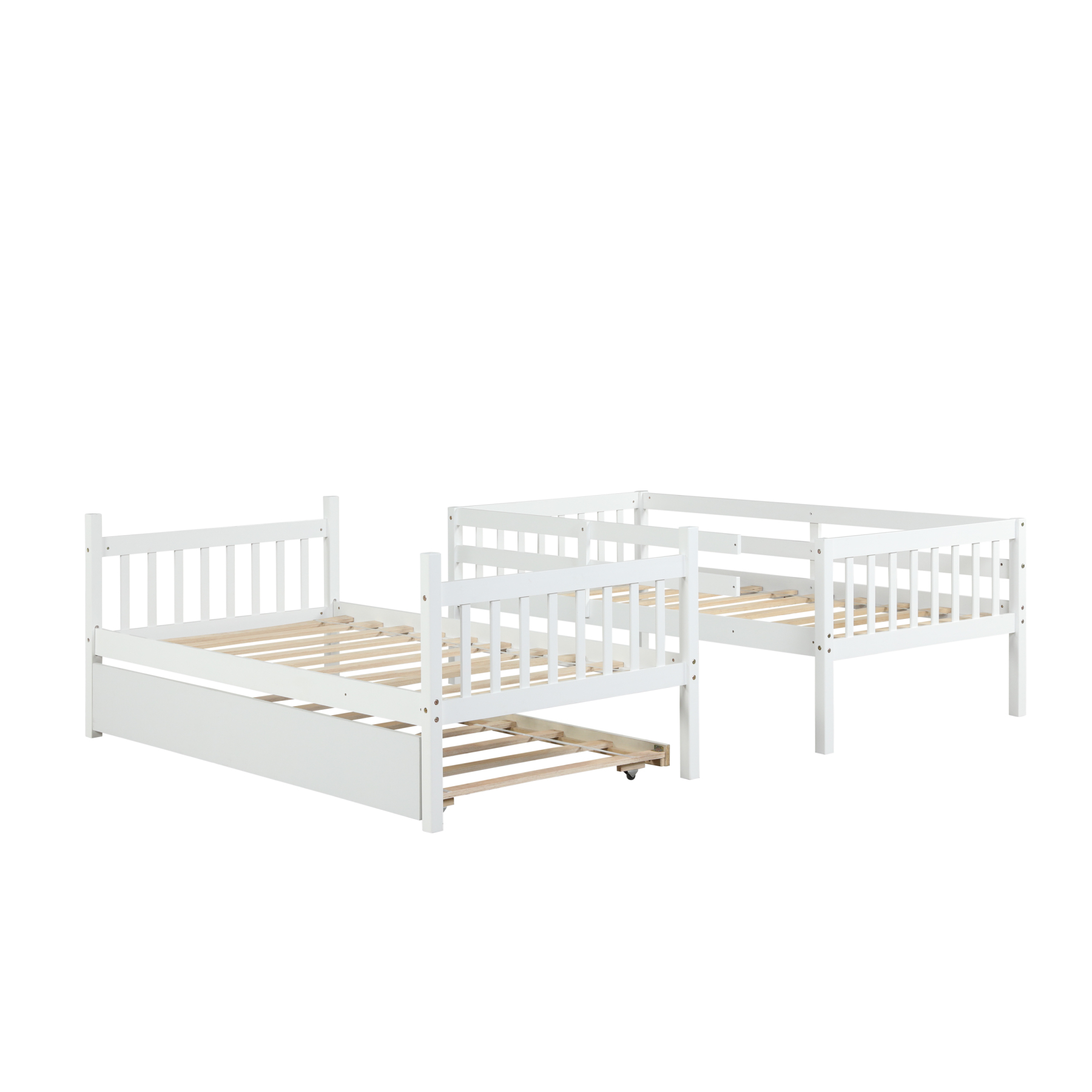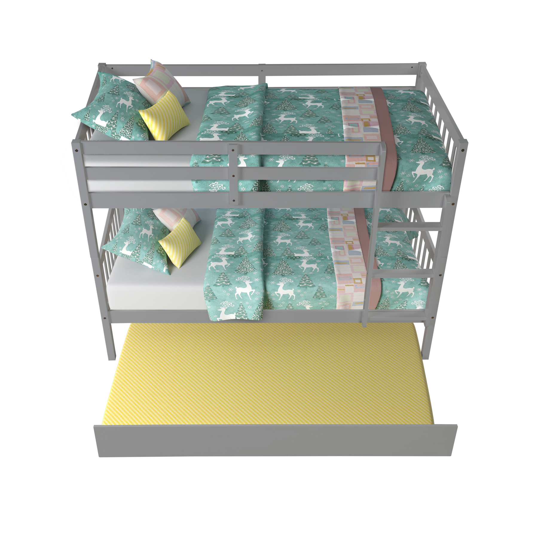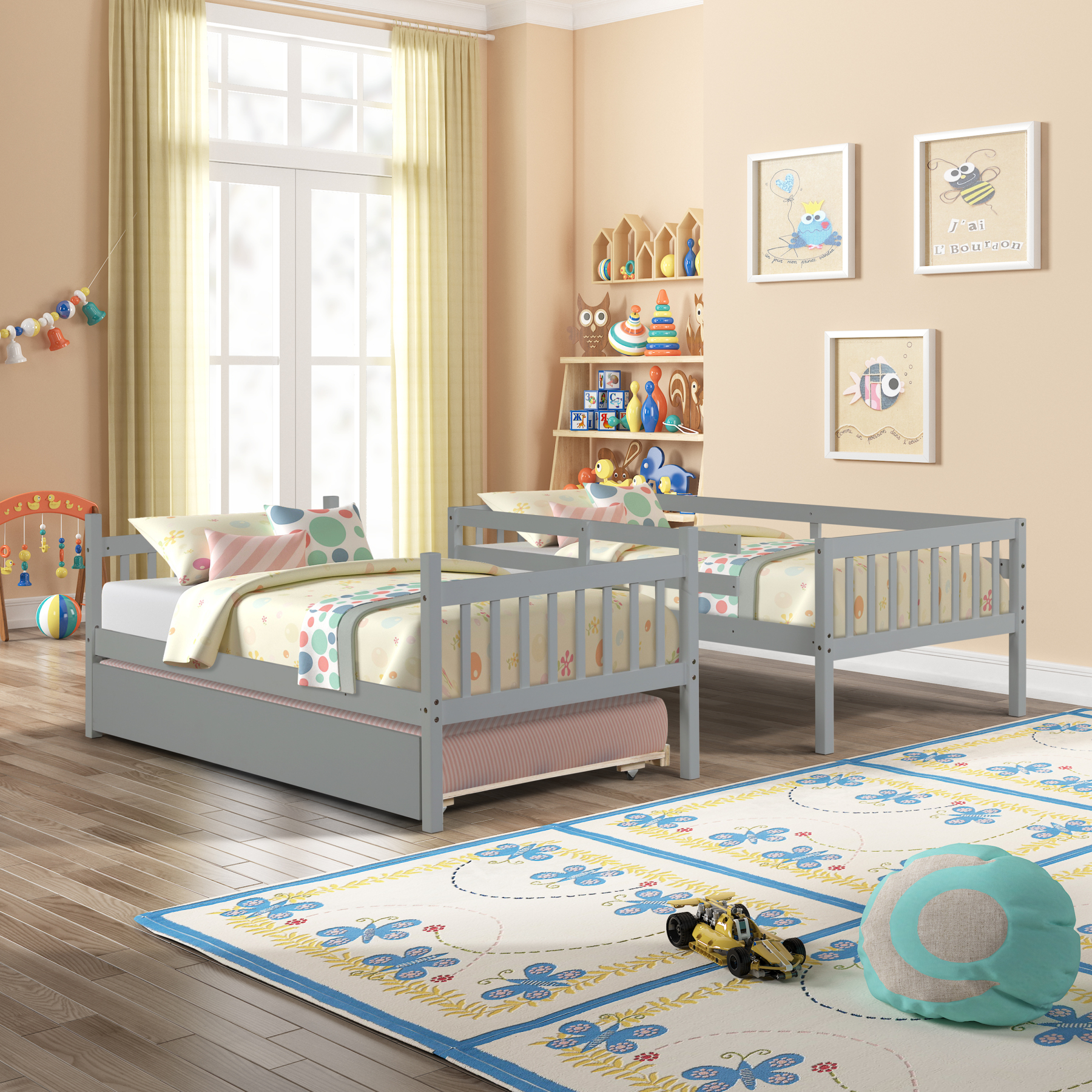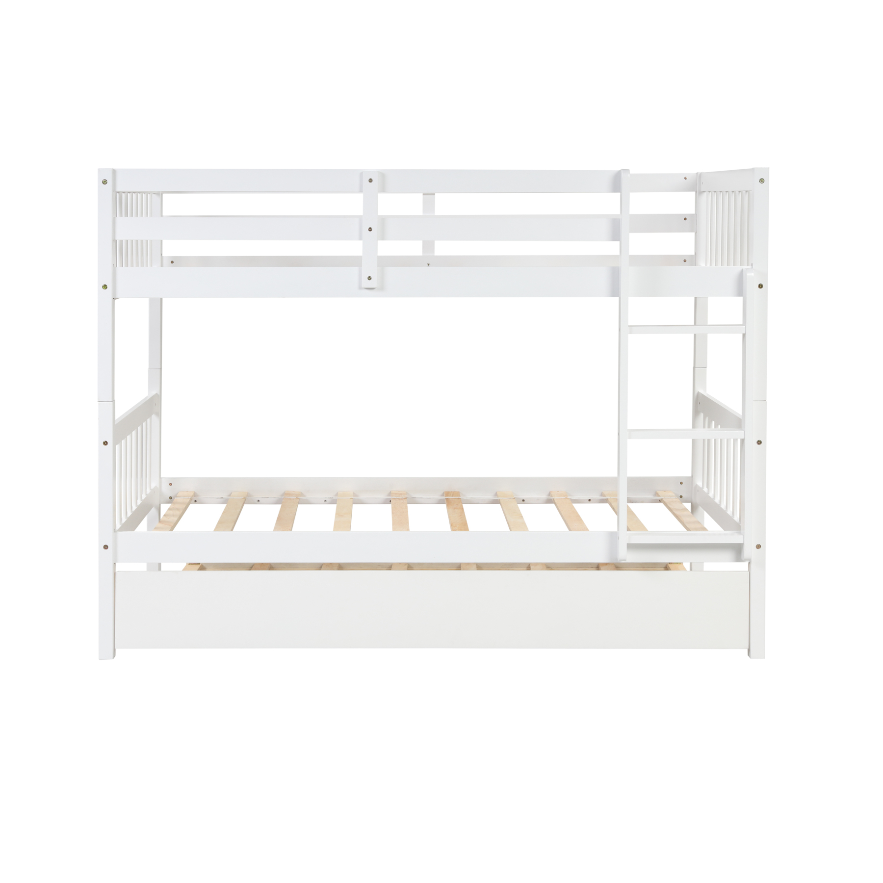 Kids Convertible Wooden Bunk Bed Frame with Twin Trundle, Safety Rail and Ladder, Twin over Twin