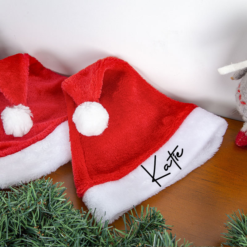 Great fun for people of all ages! Get into the Christmas spirit by wearing your personalized Santa hat out shopping, going to see SANTA or for the family photo!! They also make great party favors for birthdays or classrooms.