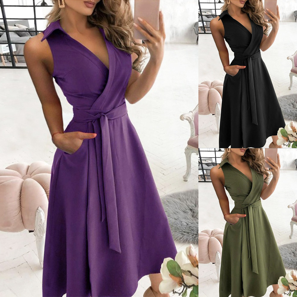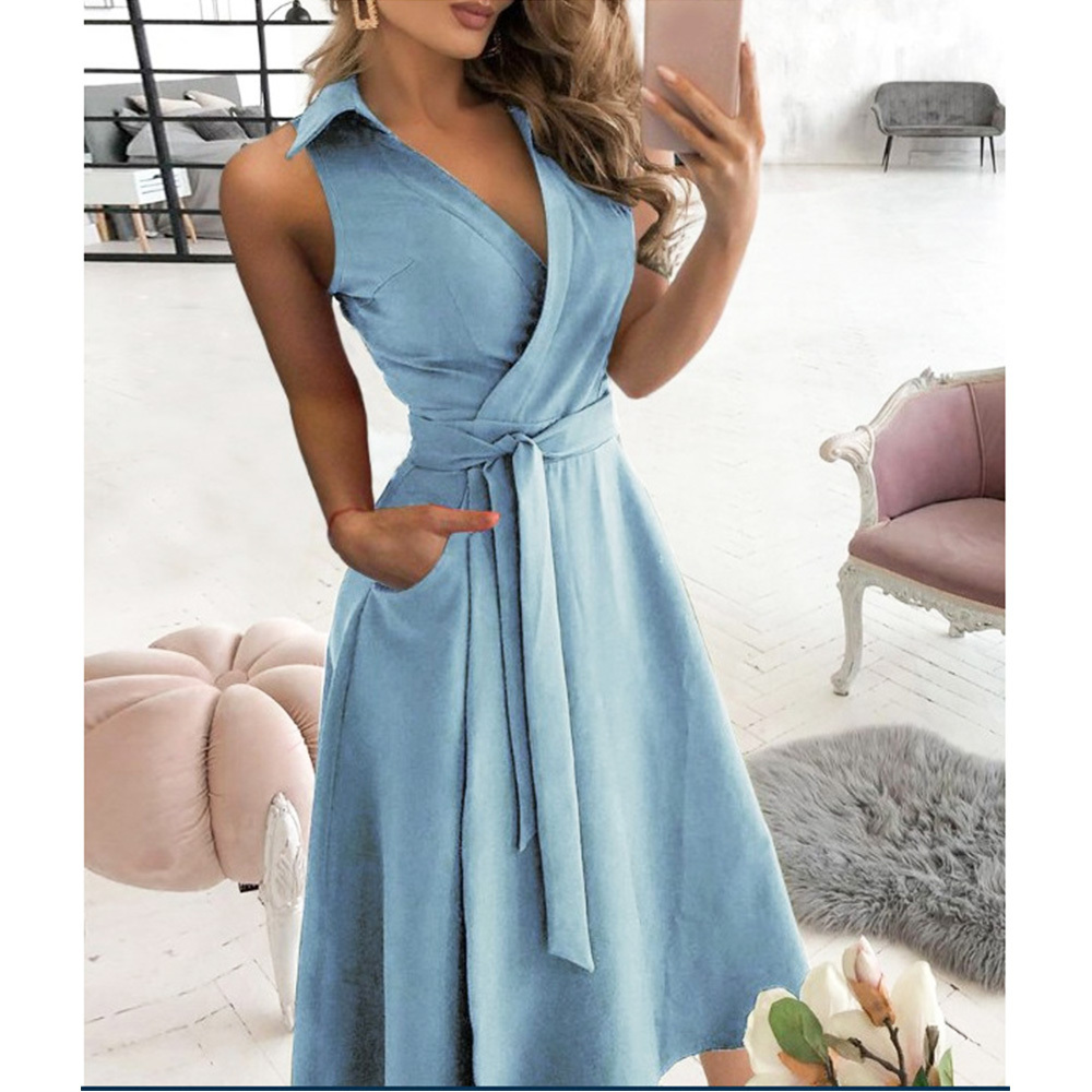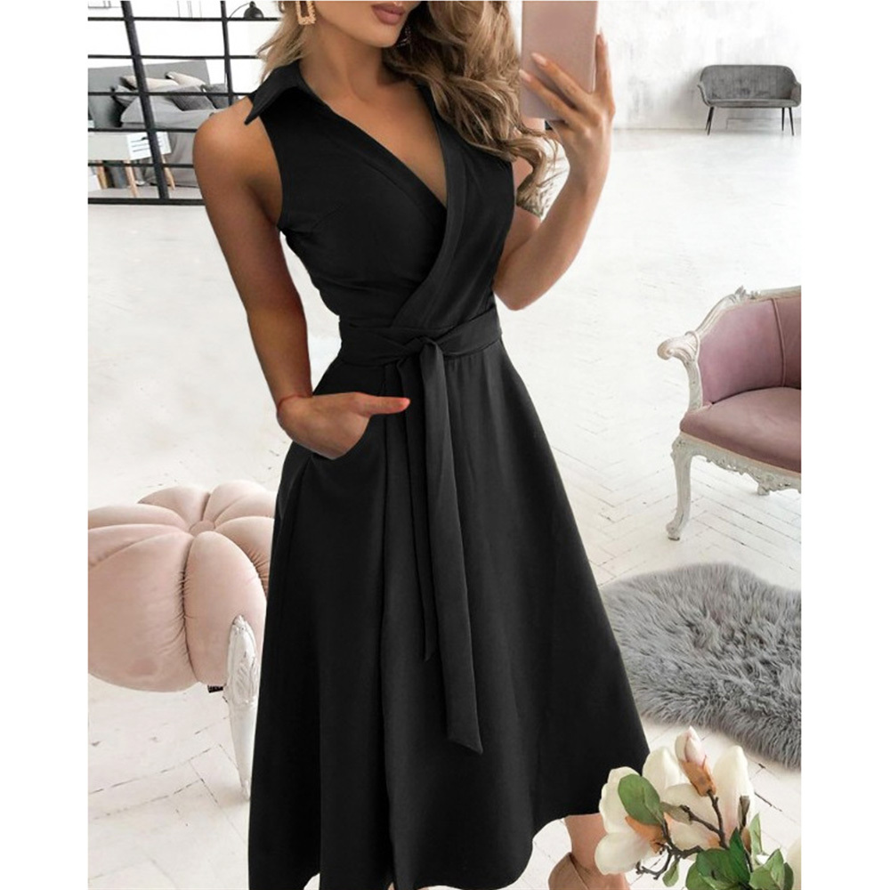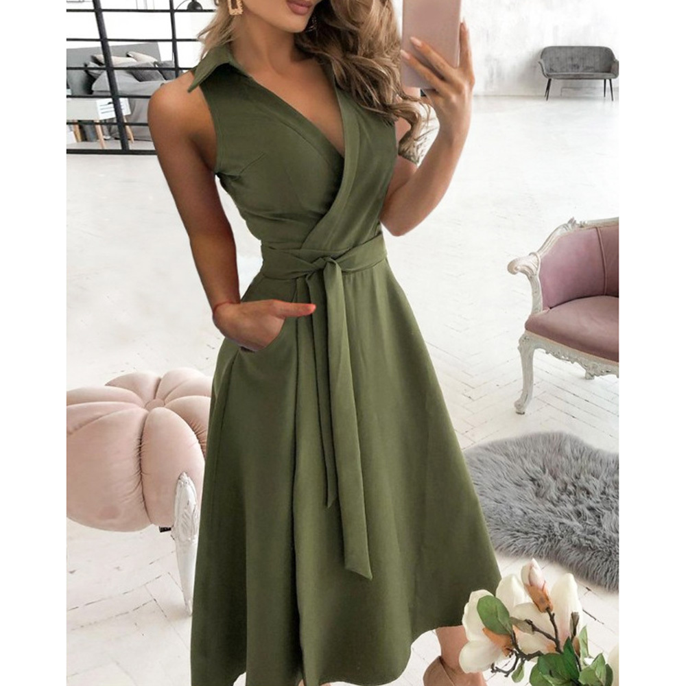 Women Sleeveless Solid Shirt Dress Midi Turn Down Collar Bandage Bodycon Dress