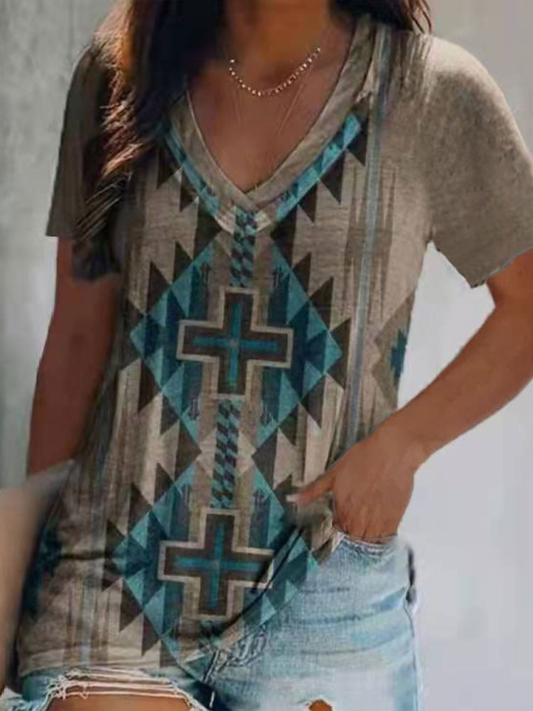 Women's Fashion New Multicolor V-Neck Diamond Print Short Sleeve T-Shirt发服务范围