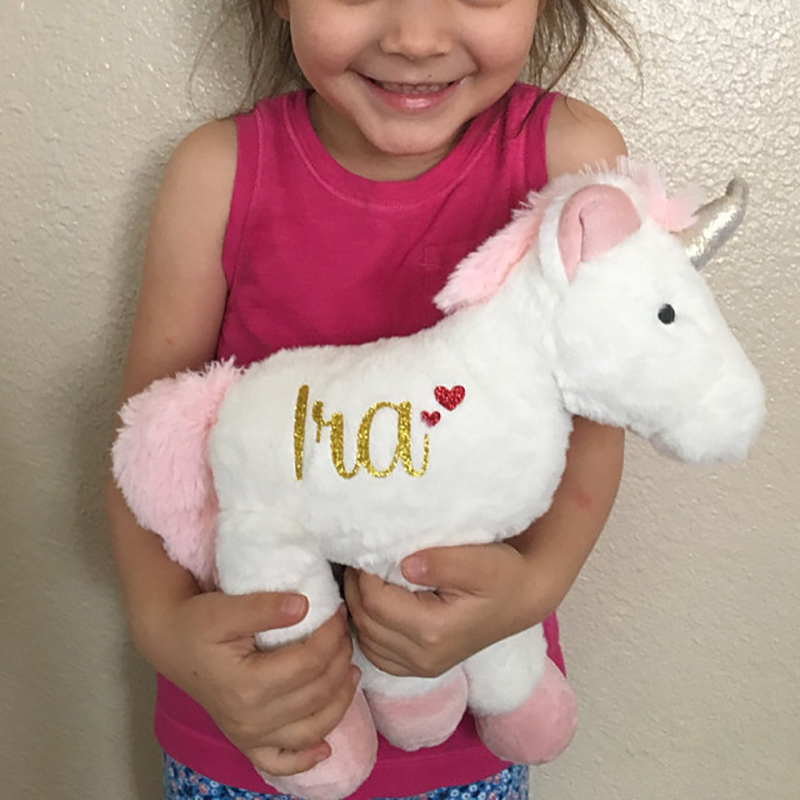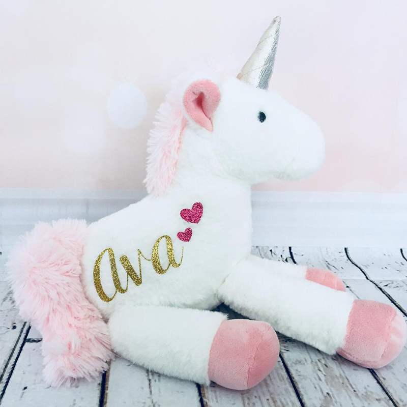 Unicorn is personalized with heat transfer vinyl in gold lettering and pink hearts (if you would like other colors please send me a message)