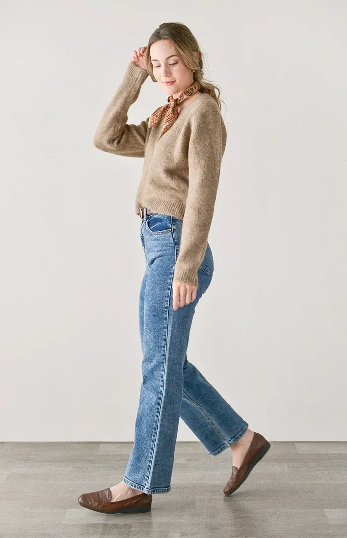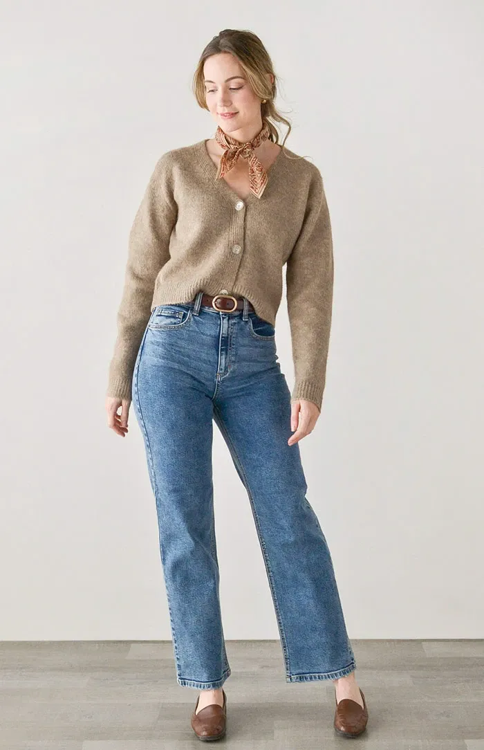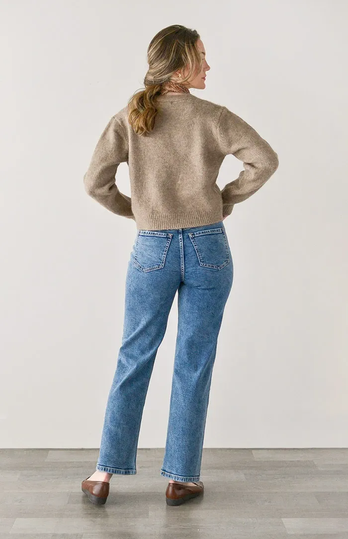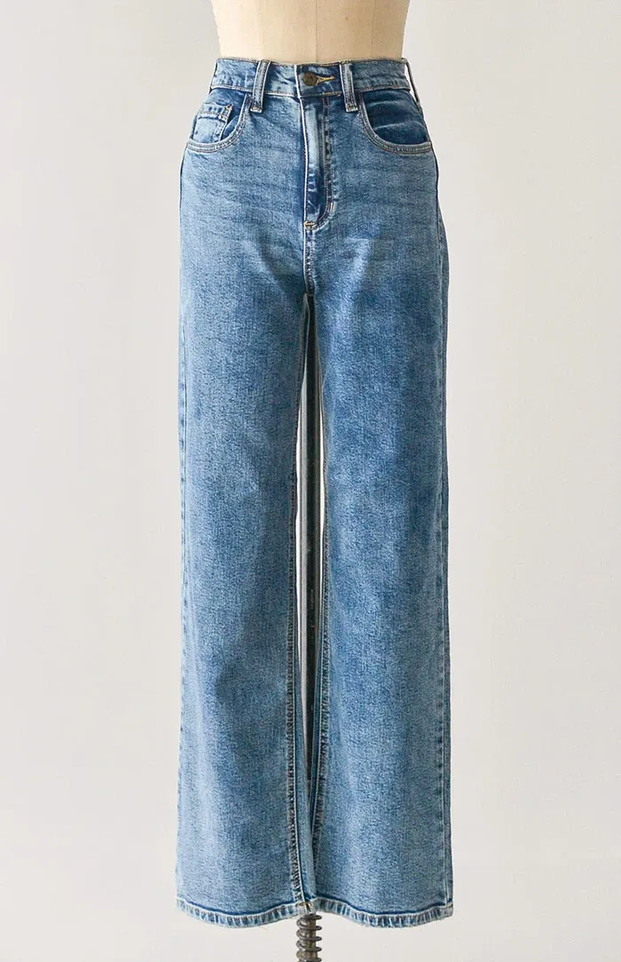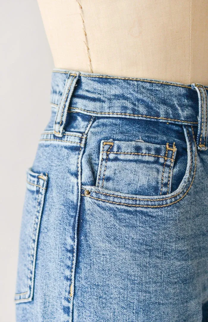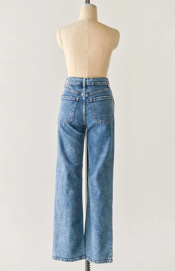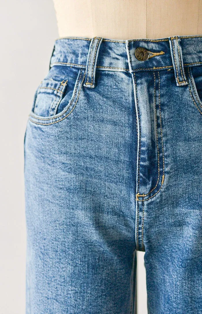 Classic and feminine with a hint of tomboy, these high waist vintage inspired jeans come in a medium wash denim and features functional side pockets, back patch pockets, and straight leg silhouette.