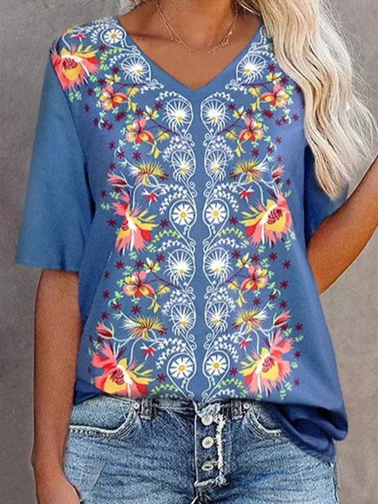 Women's Fashion New V-neck Flower Print Short Sleeve T-shirt