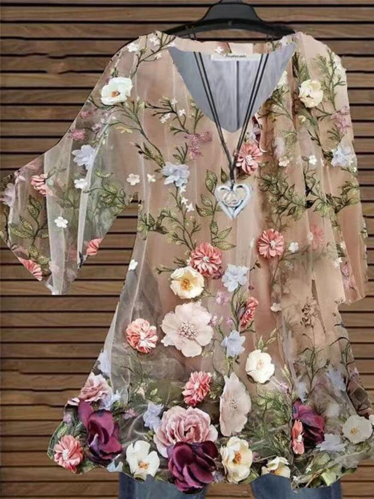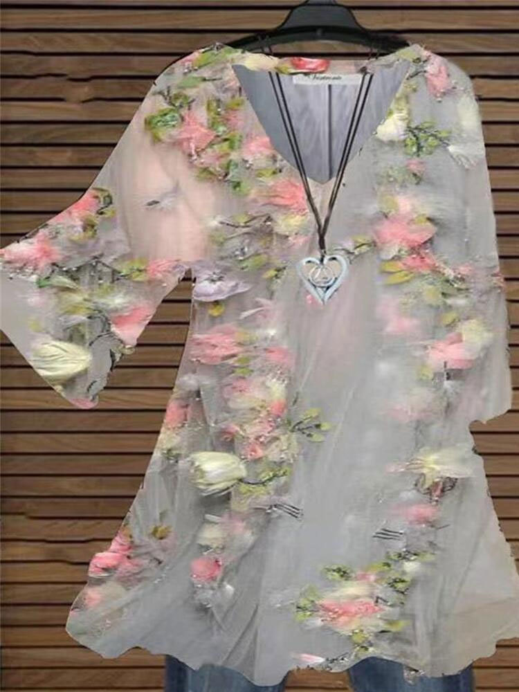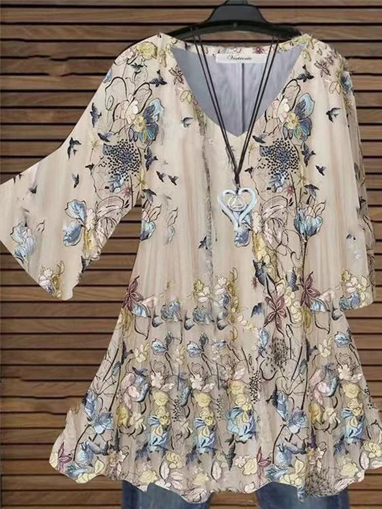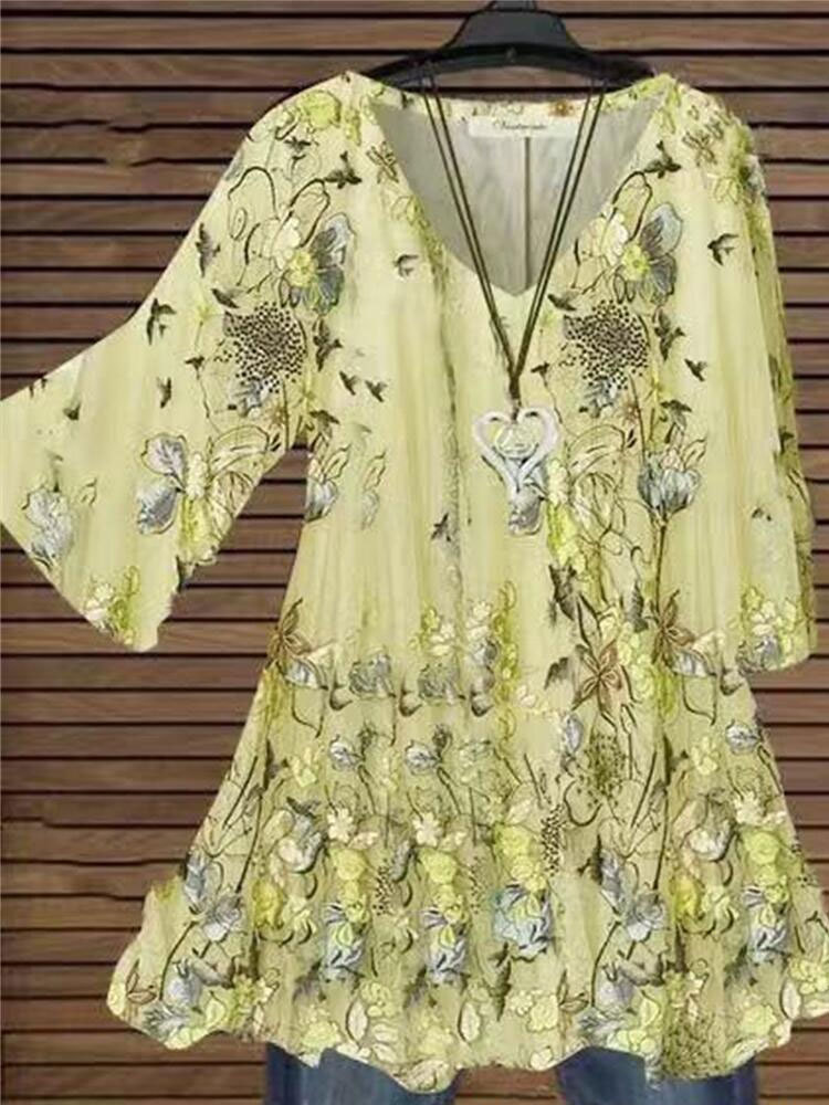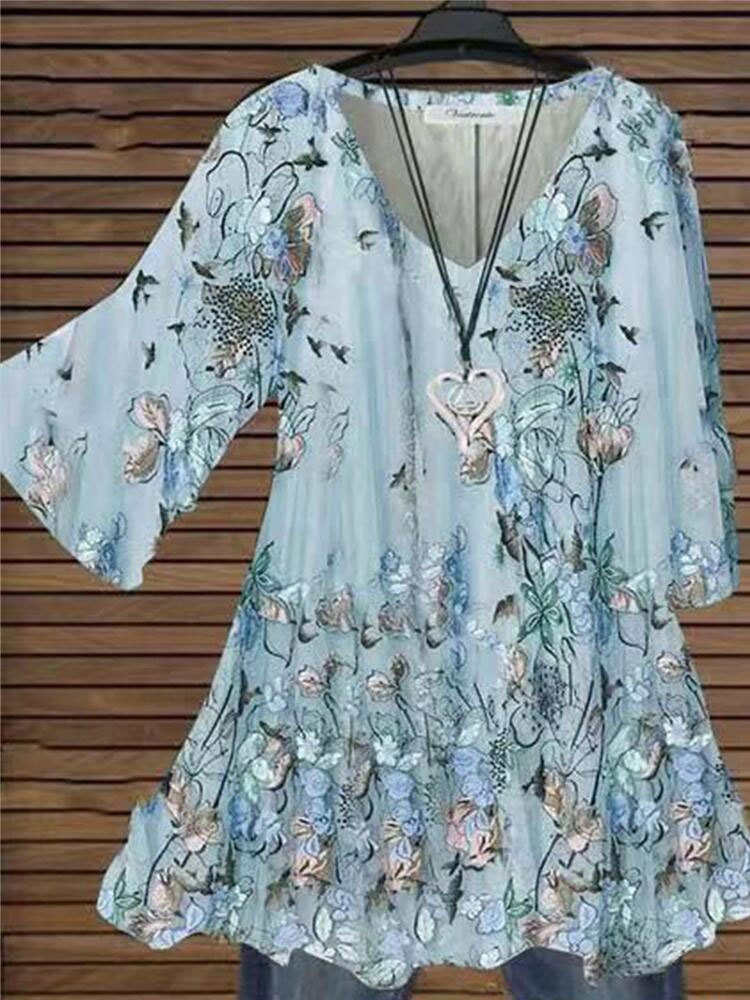 Women's Swing Flared Sleeve Printed V-Neck 3/4 Sleeve Mini Dress