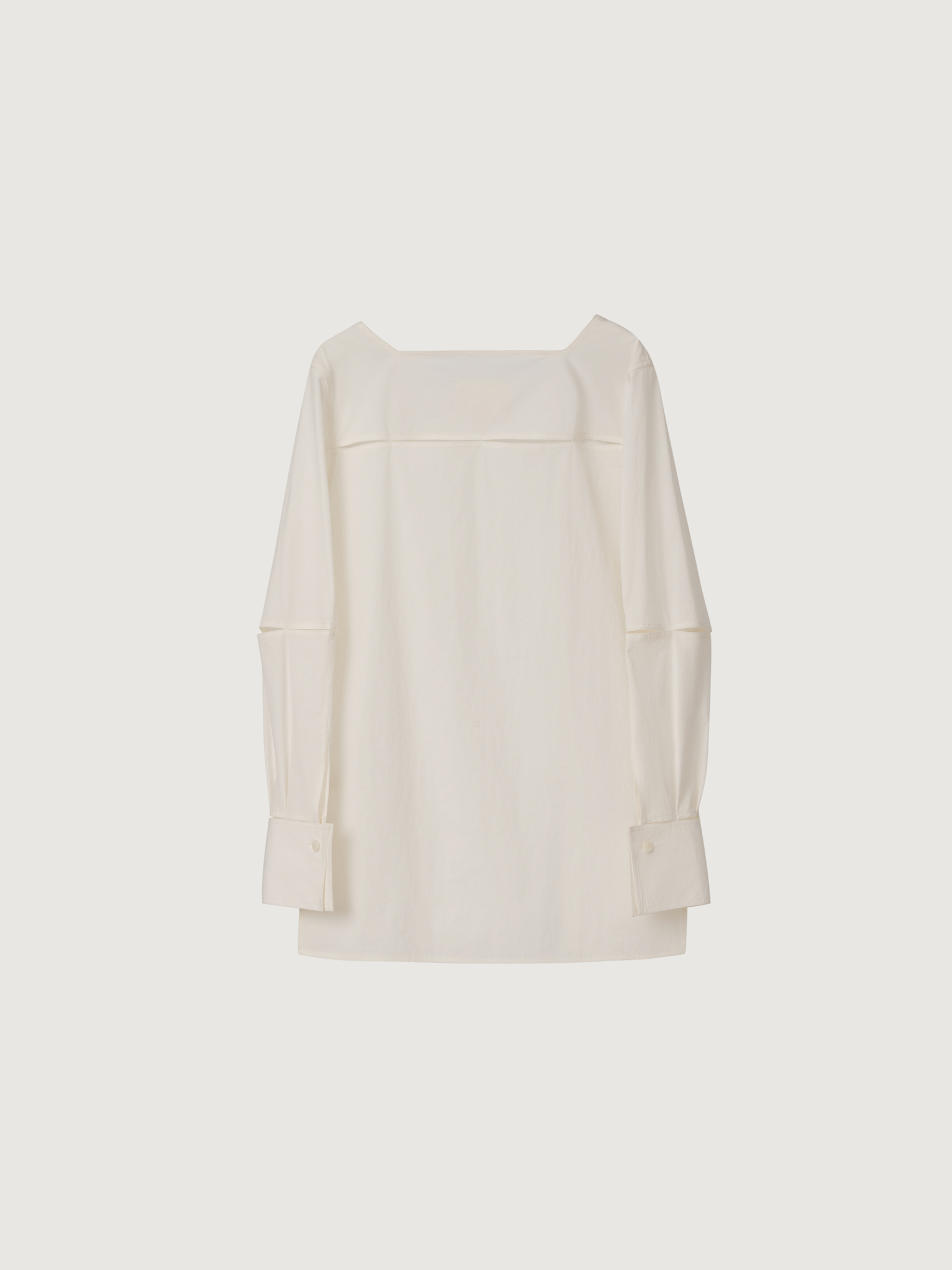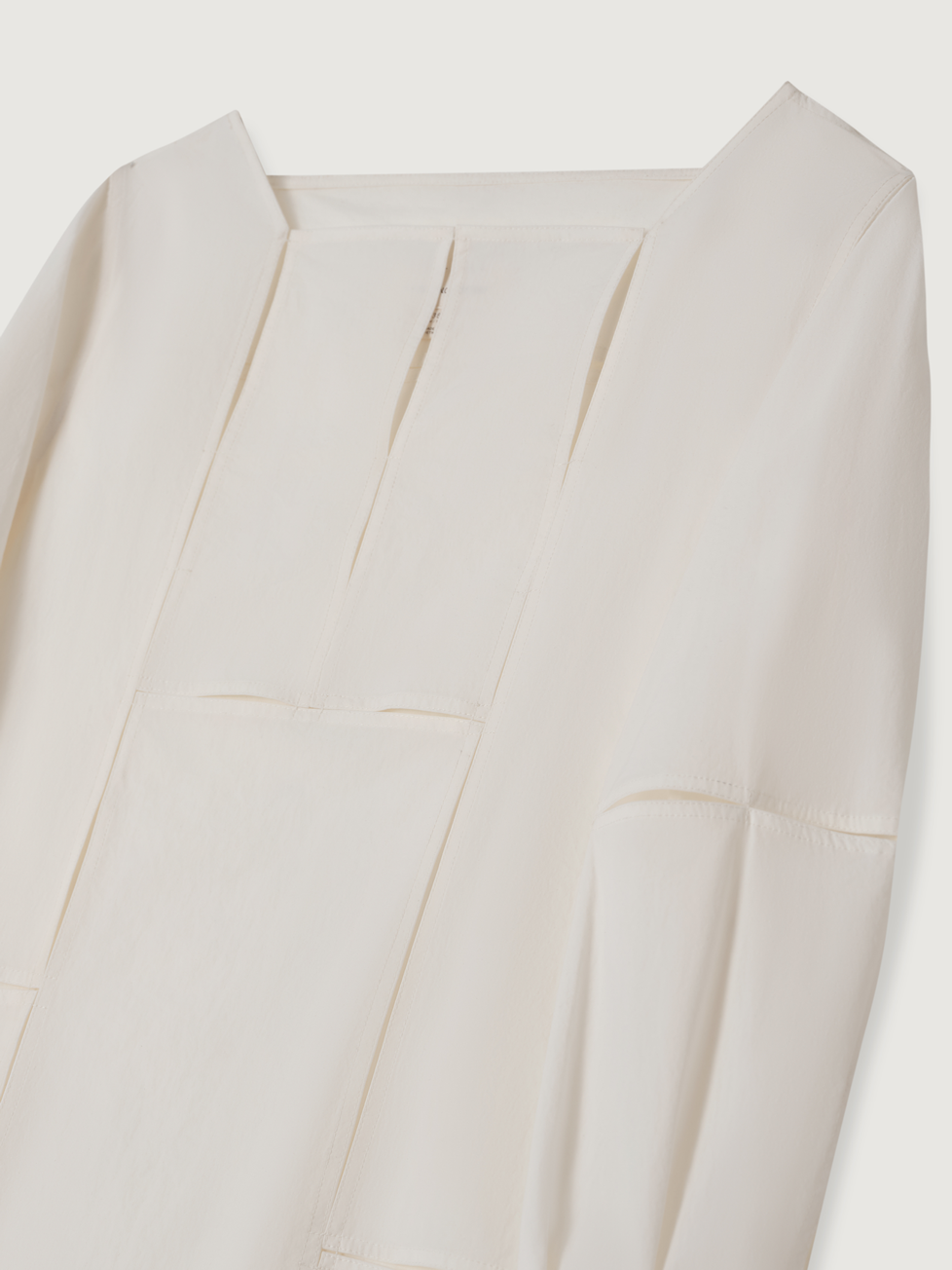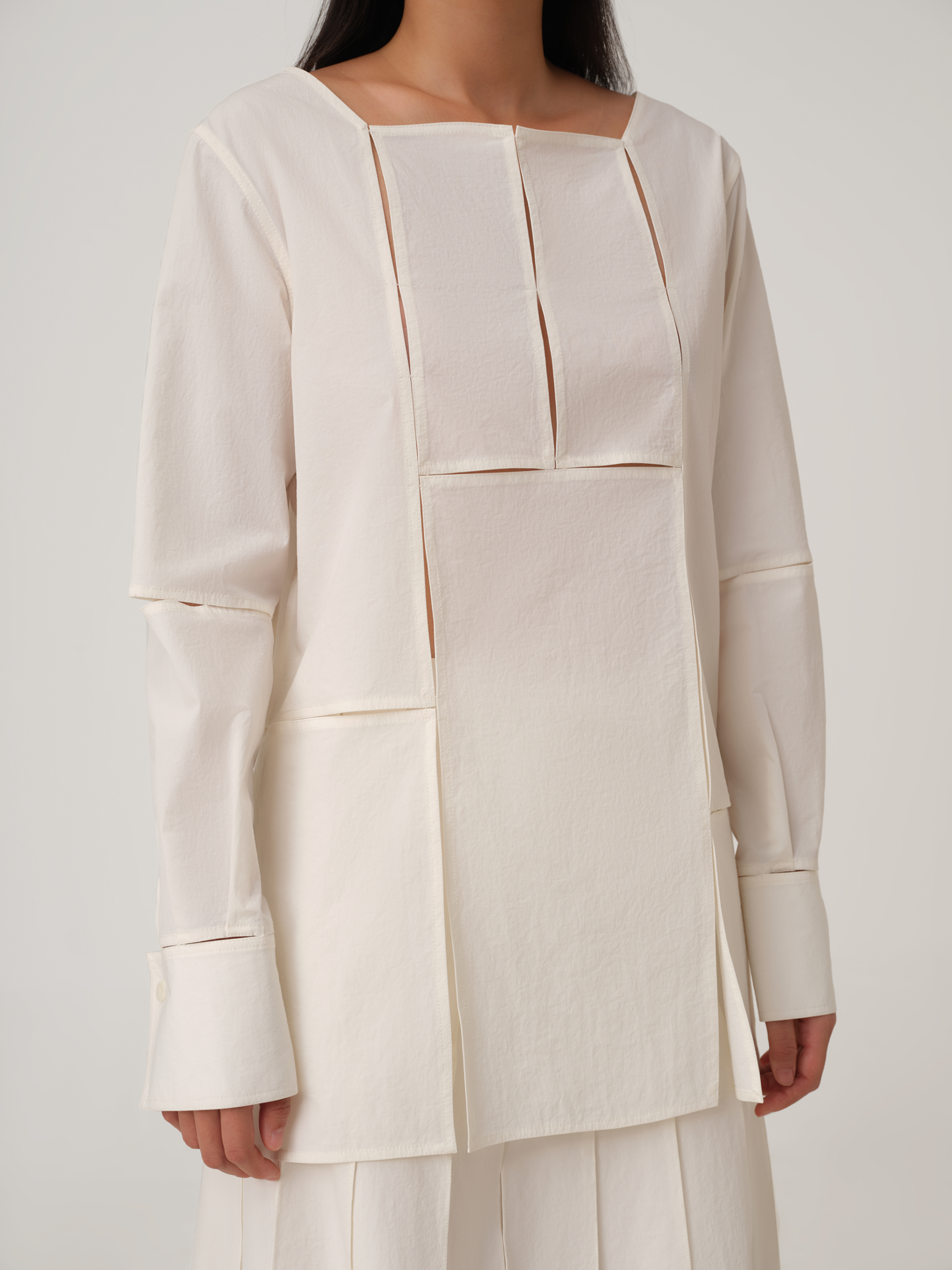 Inspired by the traditional delicate paper windows, this top is constructed with different patches of fabric, creating a cut-out illusion in movement. A square neckline, it comes with long sleeves and basic shirt cuffs.
