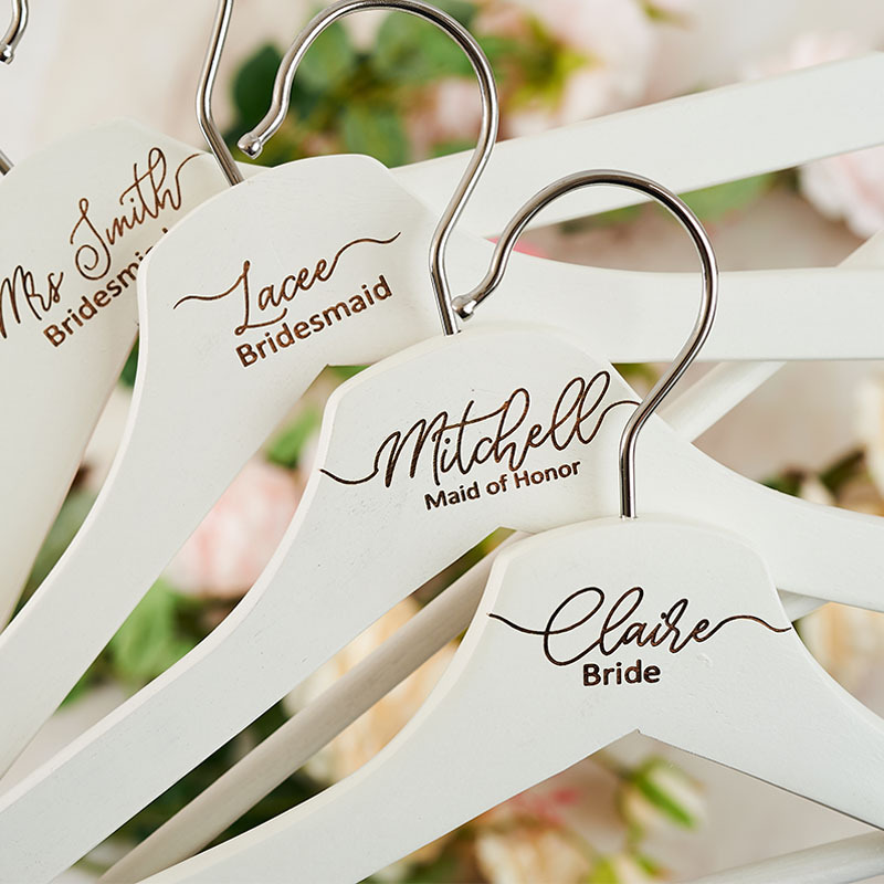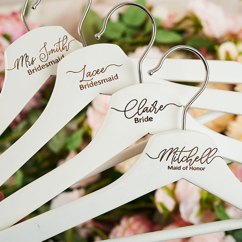 - Each bridal hanger is made from natural hardwood and expertly laser engraved to your specifications.