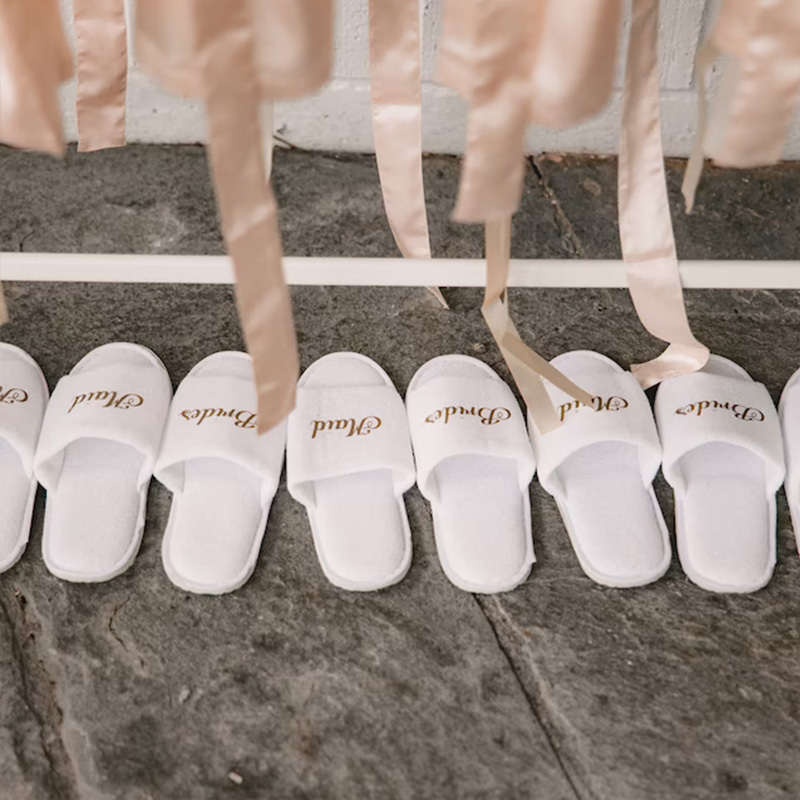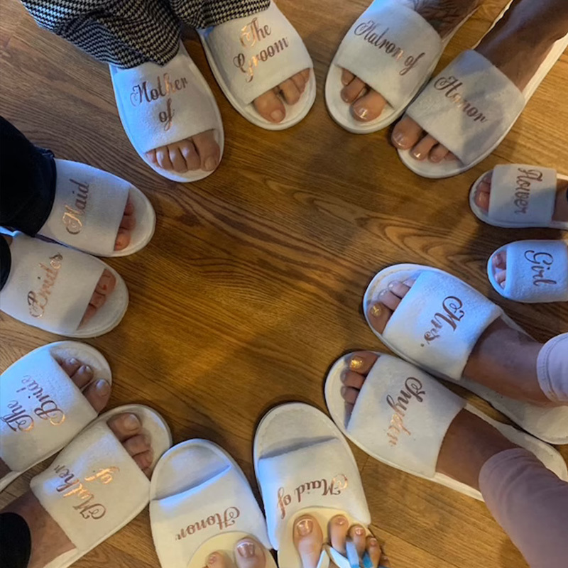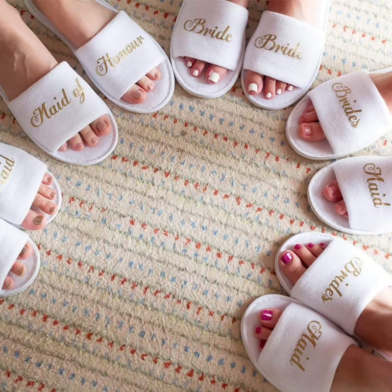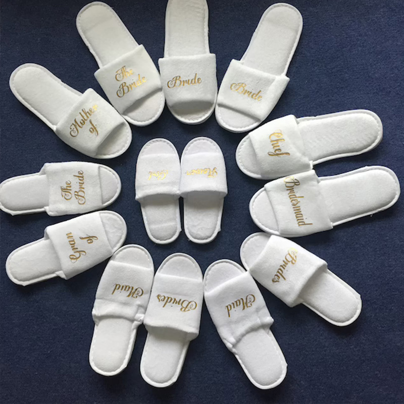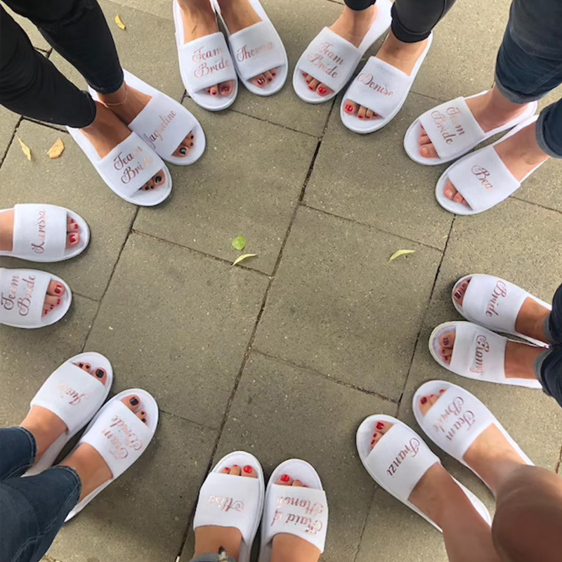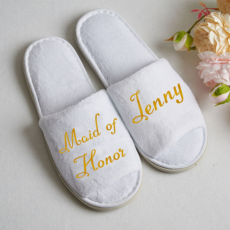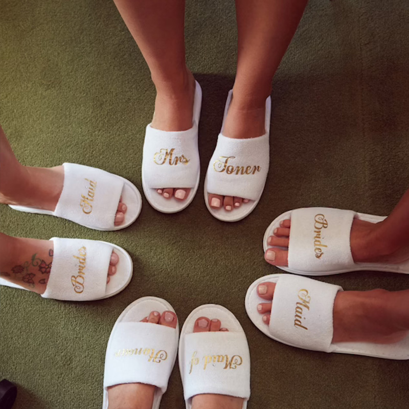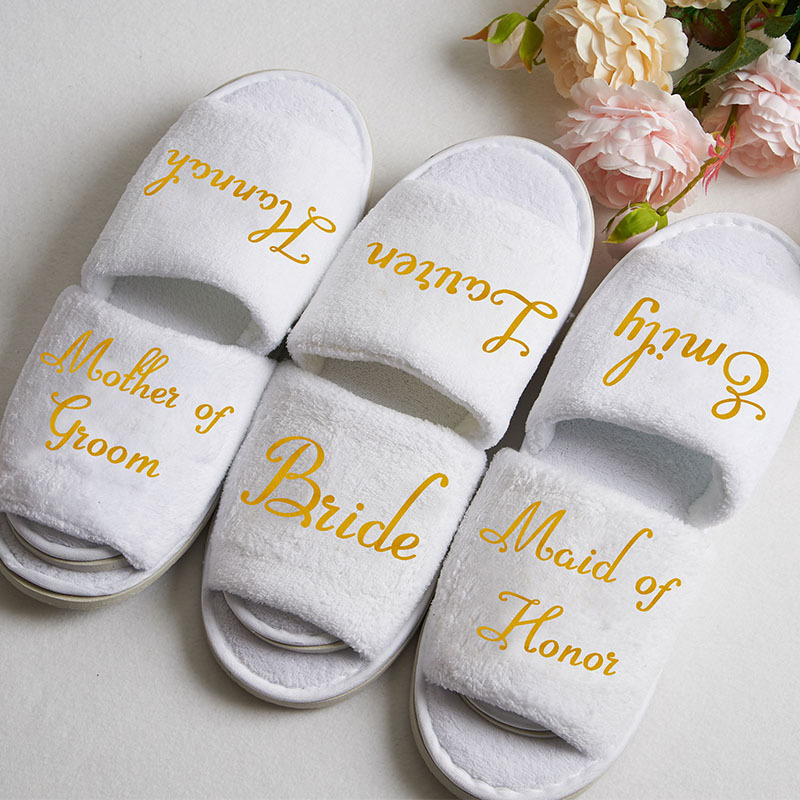 Personalised Bride slippers with gold wording, these will make a great gift for you to put in your "will you be my bridesmaid" box on bridal party evening.