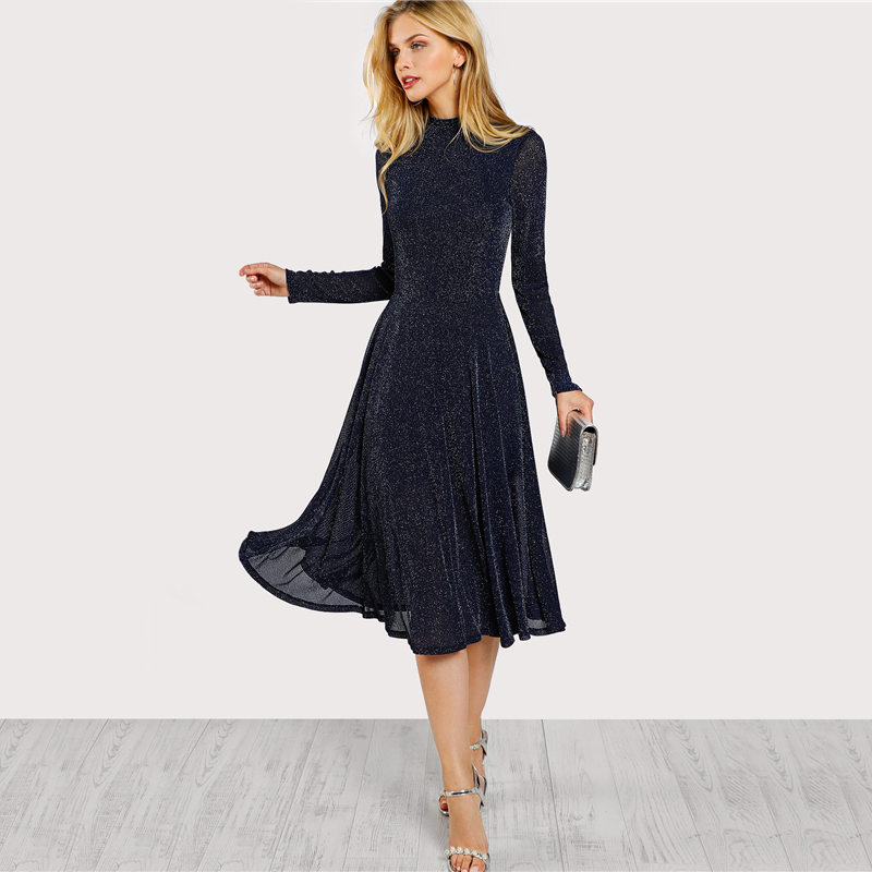 A Line Ladies Dresses Navy Long Sleeve Mock Neck Glitter Fit abd Flare Dress Stand Collar Elegant Party Dress