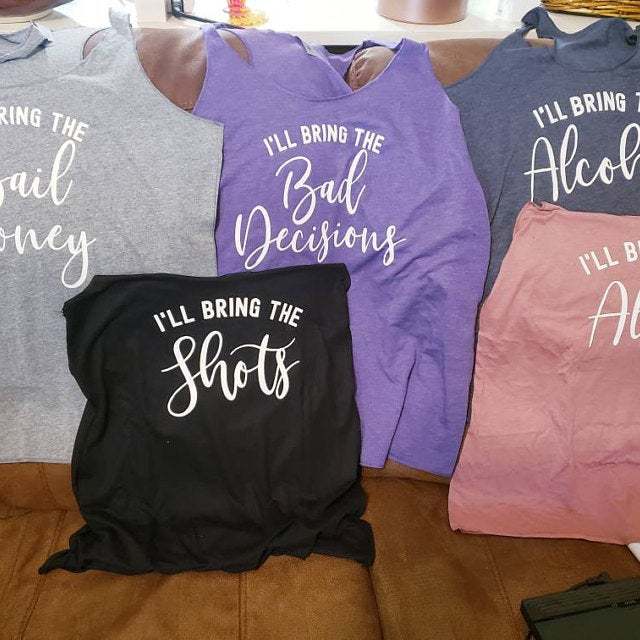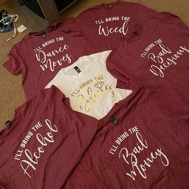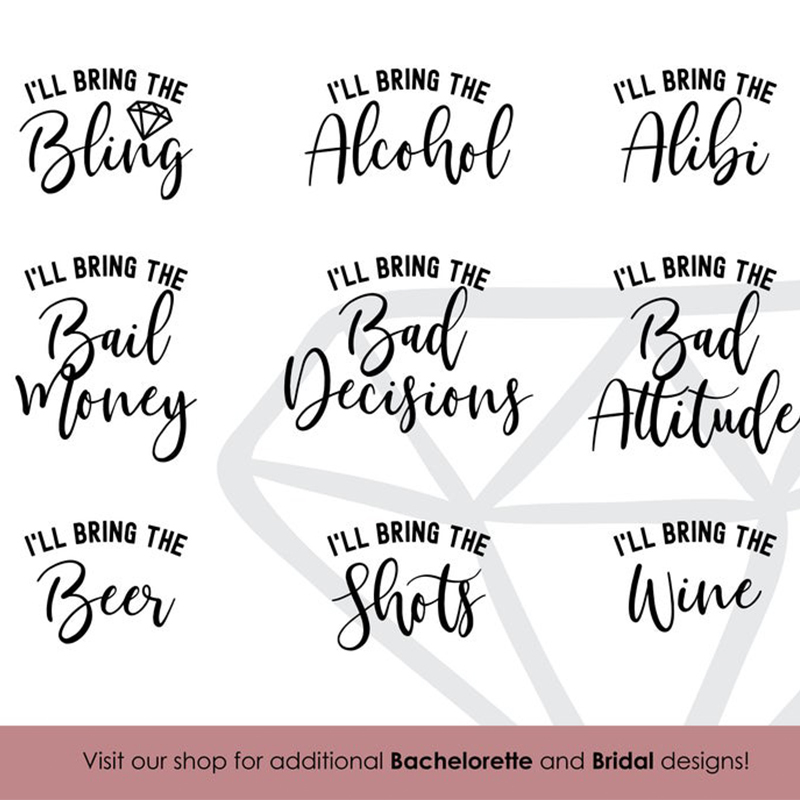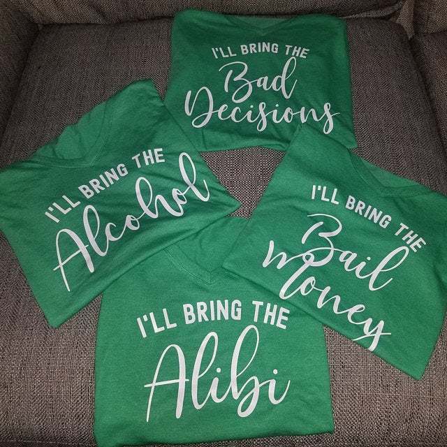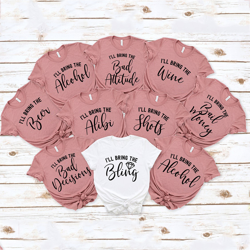I'll Bring The Bachelorette Shirts, I'll Bring The Alcohol, Bad Decisions, Alibi, Bling, Bride, Girls' Drinking Shirts, Bachelorette Party