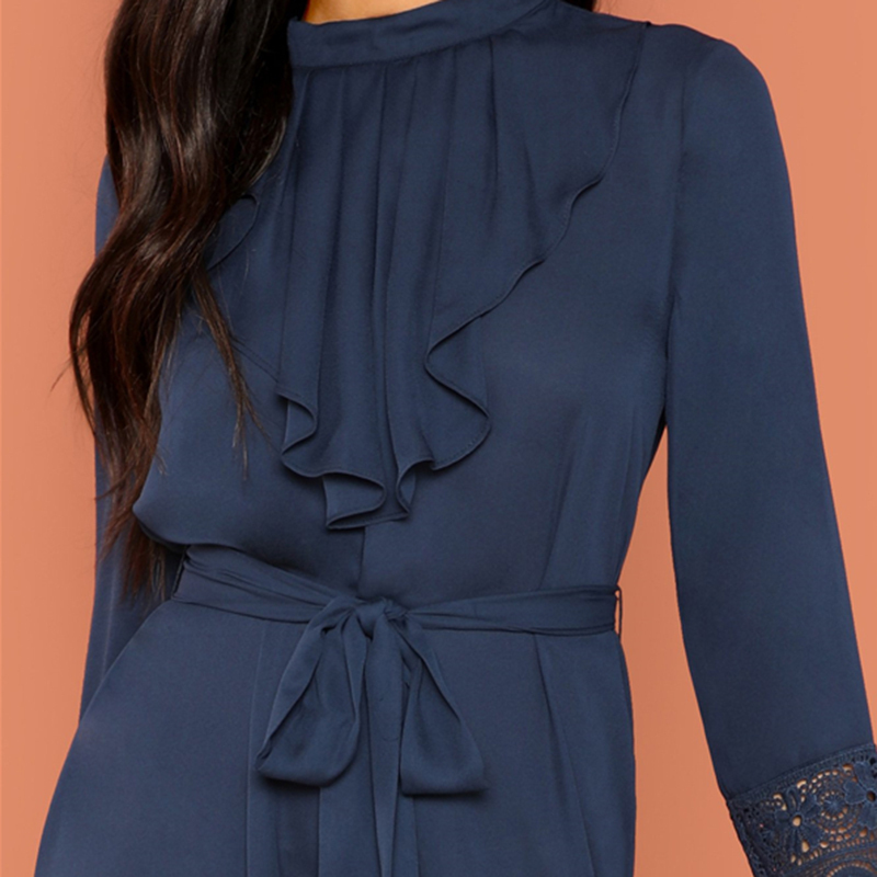 Navy Going Out Weekend Casual Pleated Ruffle Trim Lace Trim Dress 2018 Autumn Long Sleeve Elegant Dress Women Dresses